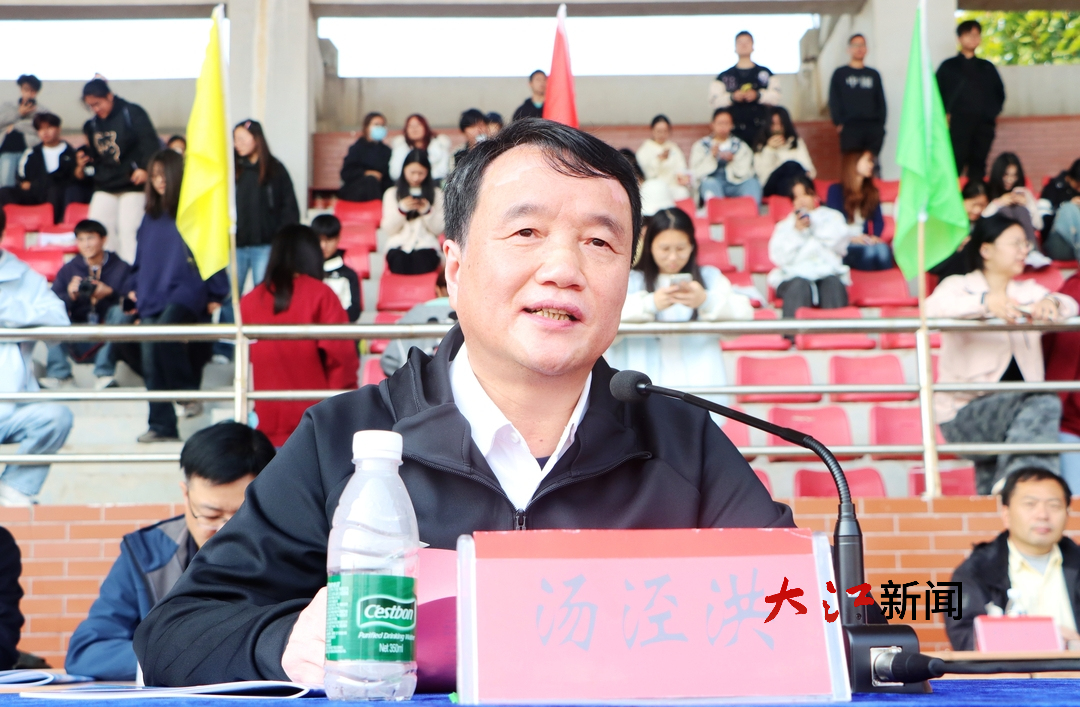 汤泾洪介绍,近年来,学校将体育学院作为独立学院重点建设,深化体育教学改革,优化课程体系,推动“体育+专业”融合发展;通过组建校队、开展阳光体育活动、举办各类赛事,营造了“人人爱运动、天天有锻炼”的浓厚氛围。师生们在赛场上捷报频传,从全国大学生攀岩锦标赛的速度冠军,到江西省运动会的金牌突破,再到中国大学生健康活力大赛的亮眼表现,每一份成绩都彰显了九江职业大学人的拼搏底色。随后,他提出4点希望,即师生以运动会为契机,走向运动场,让运动成为生活的习惯,让健康成为人生的财富。运动员弘扬奥运精神,赛出成绩与风格。裁判员秉持公平原则,严谨执裁。学生增强安全意识,文明观赛,让友谊与尊重成为运动会底色。