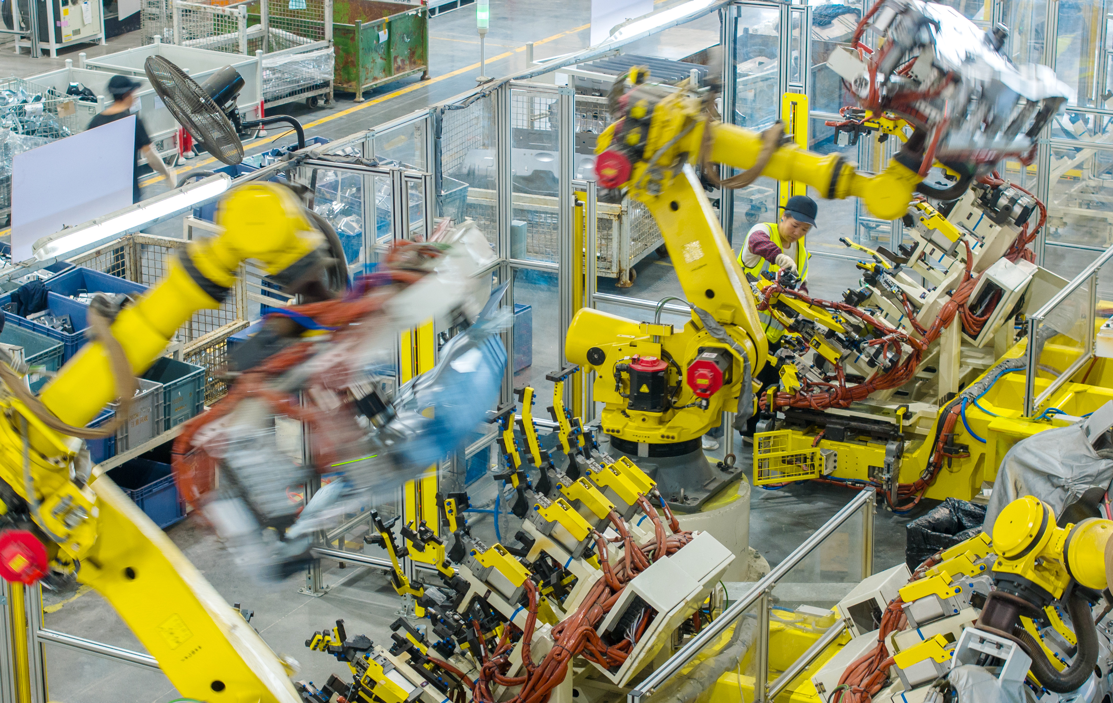浙江省湖州市长兴经济技术开发区的长兴地通汽车部件有限公司技术人员操控工业机器人生产新能源汽车配件(无人机照片,2025年10月9日摄)。新华社发(谭云俸 摄)