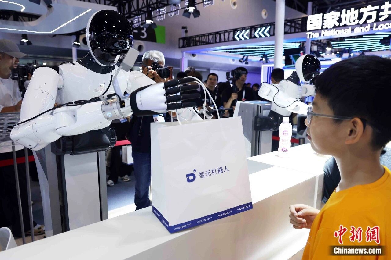 2025年7月26日,2025世界人工智能大会在上海开幕。图为机器人分发产品资料。中新社记者 汤彦俊 摄