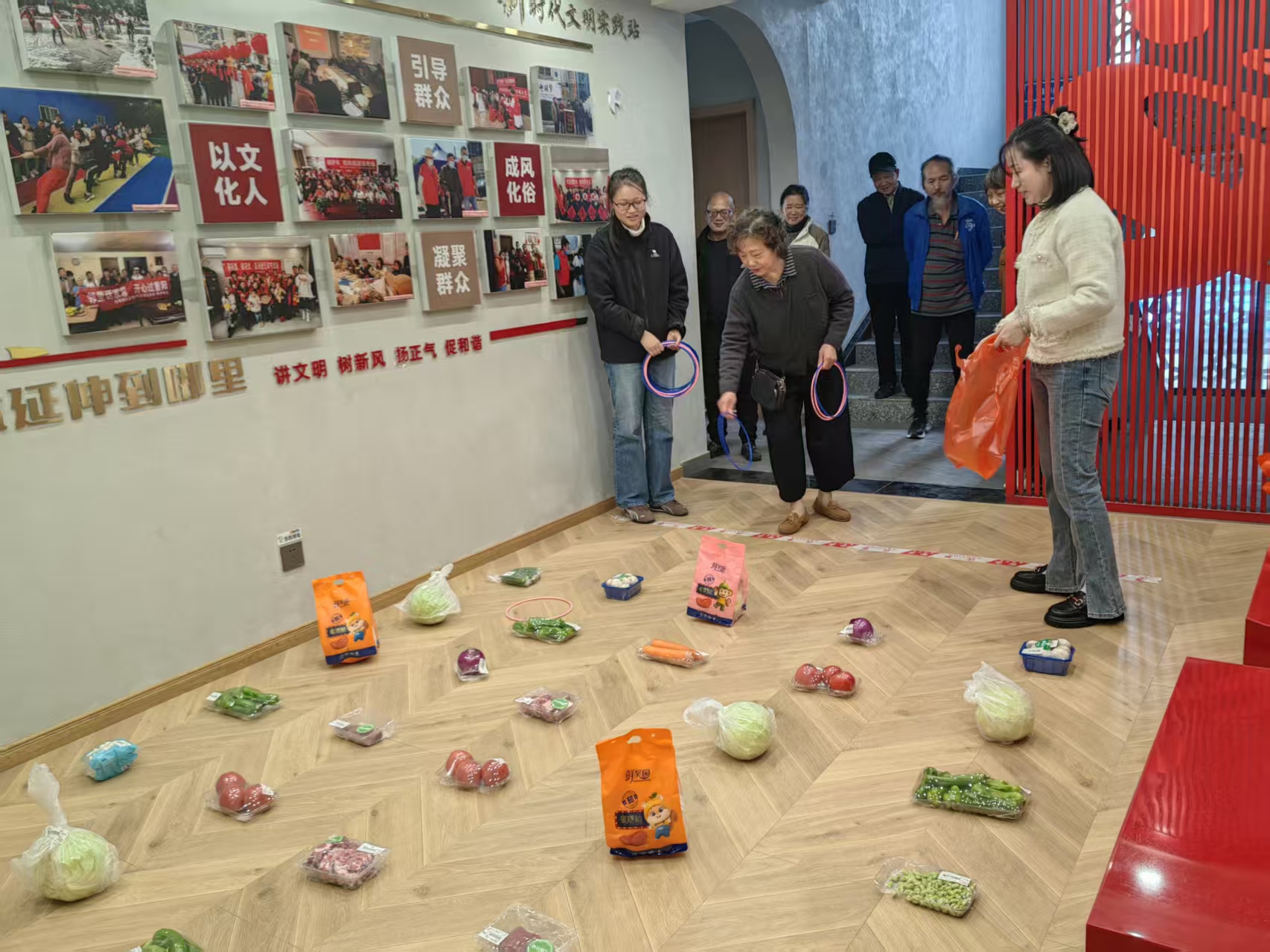 为了让生日会更加生动有趣,本次活动特别设置了趣味套果蔬环节。工作人员将蘑菇、西红柿、包菜、苹果、柚子等各式新鲜果蔬整齐地摆放在地上,代替了传统的玩具奖品。老人们手持套圈,兴致勃勃,全神贯注地瞄准自己心仪的“目标”。
