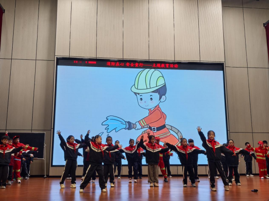 随后,二(1)中队全体同学带来了精彩的消防主题表演。他们用充满童趣的消防操舞蹈,配合朗朗上口的消防安全口诀,在活泼的律动中演绎了预防火灾、正确报警和火场逃生的关键方法。同学们动作整齐、精神饱满,用充满活力的表演将现场气氛推向高潮,赢得了全场热烈的掌声。