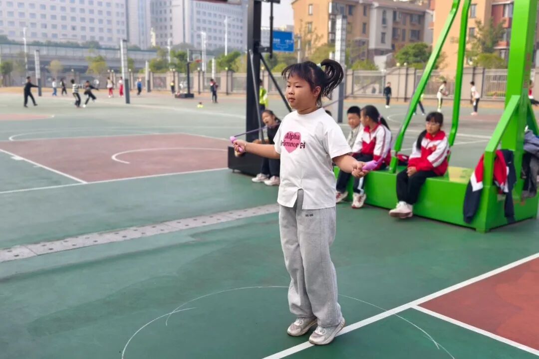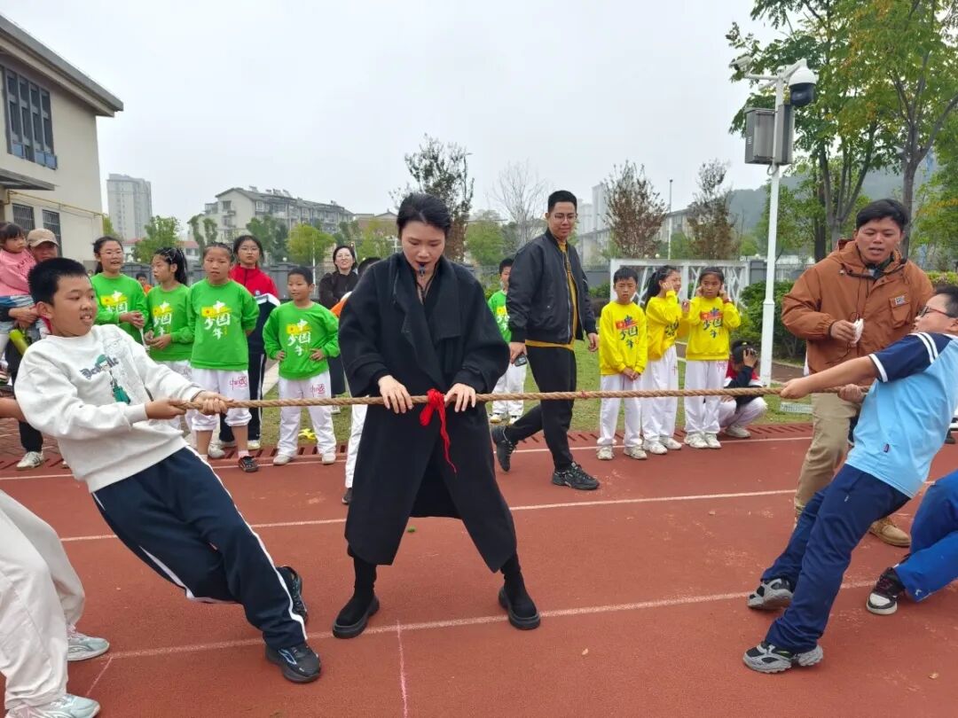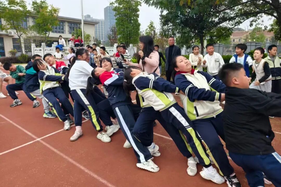 接力赛场上,小选手们个个精神饱满、斗志昂扬。他们紧攥接力棒,如离弦之箭般奋力冲刺,每一次交接都精准默契,仿佛心有灵犀。而拔河比赛则彻底点燃了全场气氛:两队队员脚蹬地面、身体后倾,双手如铁钳般紧握绳索,在 “加油” 声中奋力拉扯,绳子中间的红绸带来回摆动,场面紧张到让人屏息。此刻,每个人的心跳都与班级的脉搏同频共振,为了集体荣誉拼尽全力。
