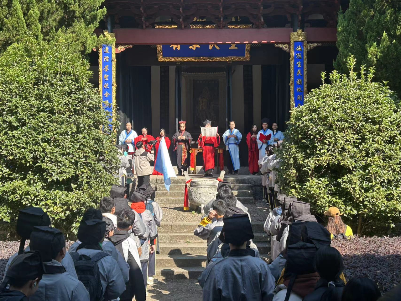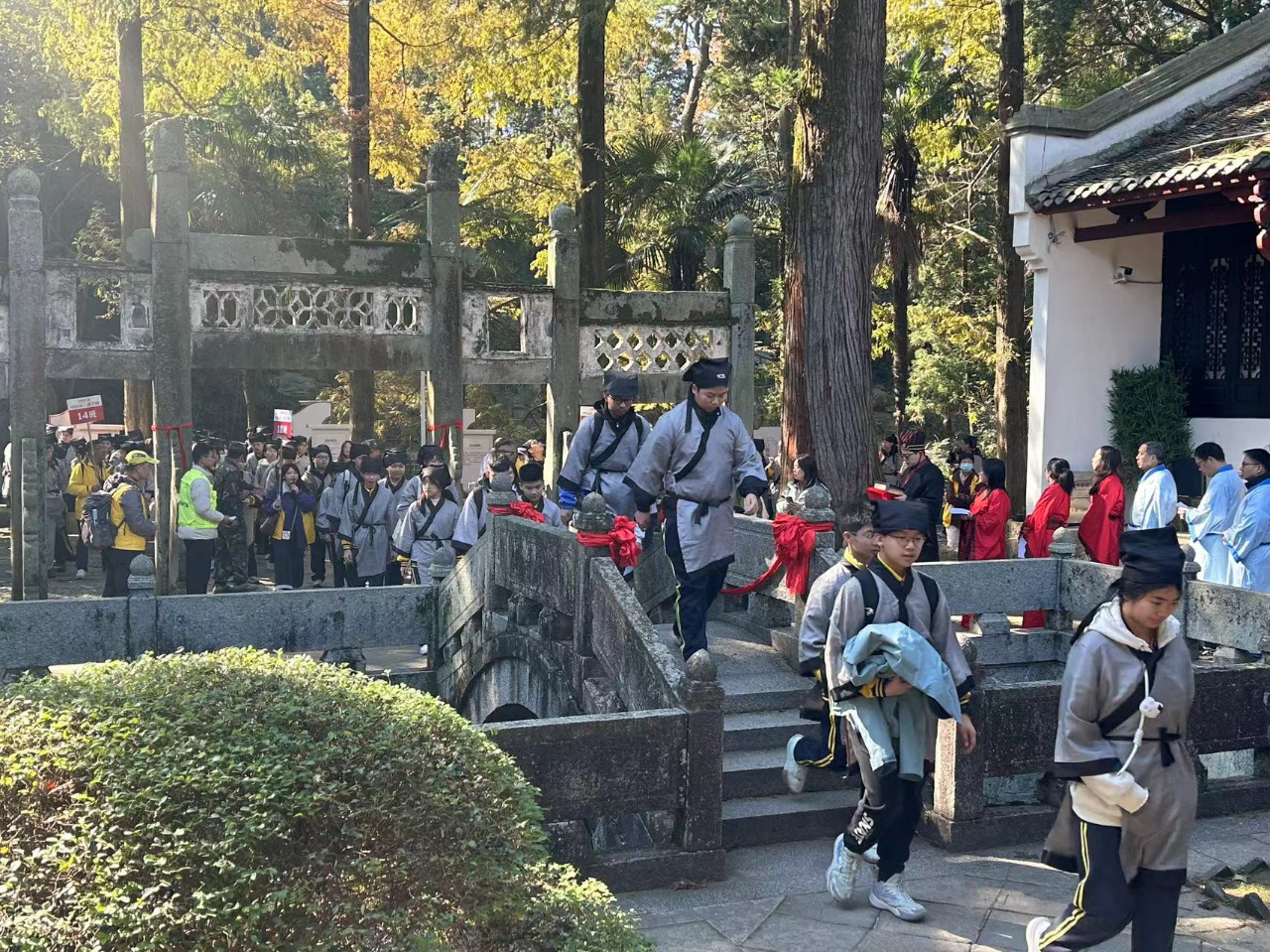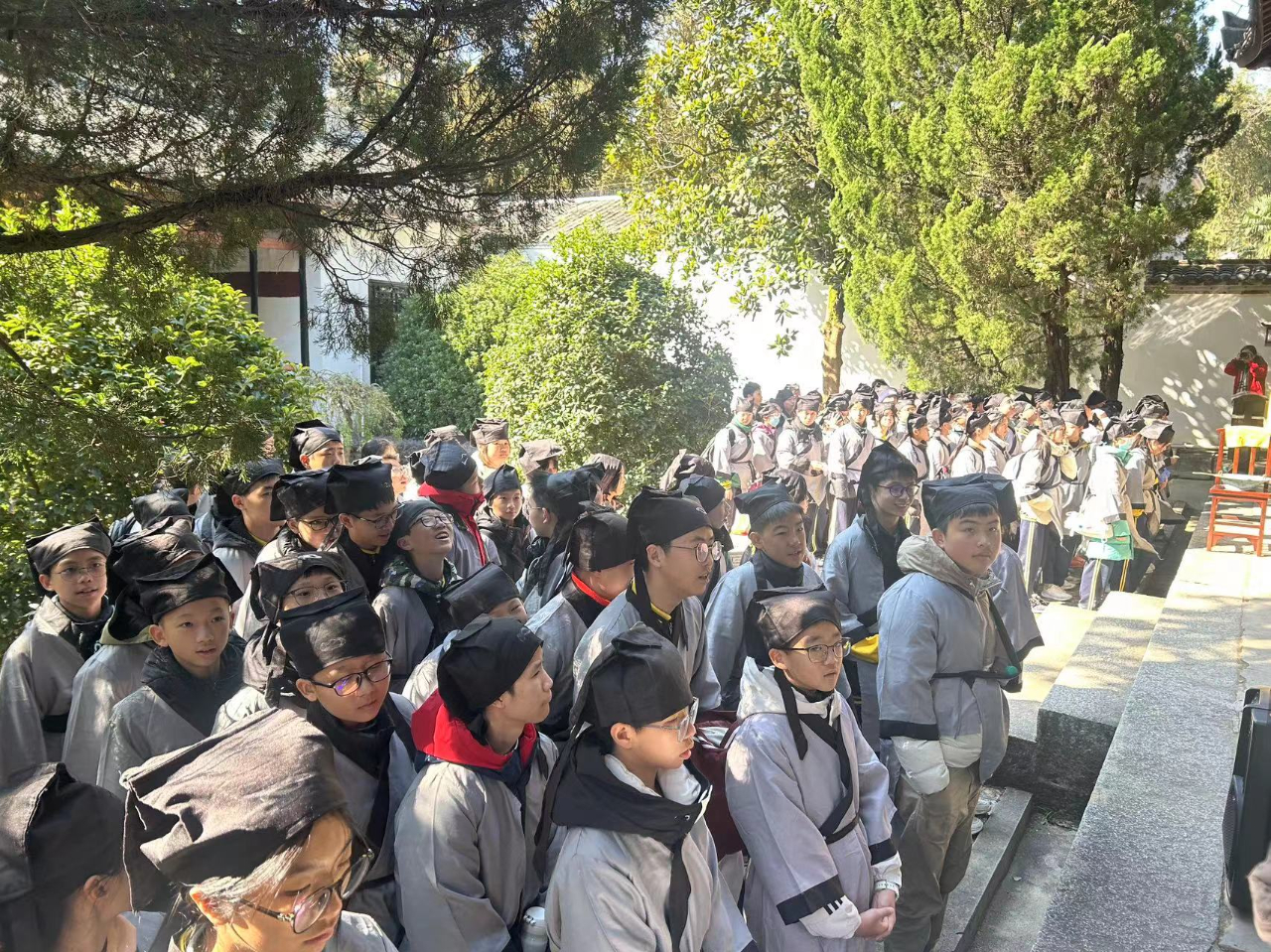 初冬时节,古木参天的书院更显庄重幽静。研学之旅从棂星门开始,学生们在此换上传统书生服饰,仿佛进行了一场与历史的对话,悄然融入这片文化圣地。随后,师生们跟随引导,有序步入礼圣殿,向儒家先贤孔子像行拜谒之礼,并聆听师训,重温尊师重道、崇学尚贤的中华传统美德。活动现场,学生们神情庄重,依古制行礼,表达对先贤的崇高敬意。这场跨越千里的仪式,不仅是一堂生动的礼仪课,更是一次深刻的文化寻根与精神洗礼。