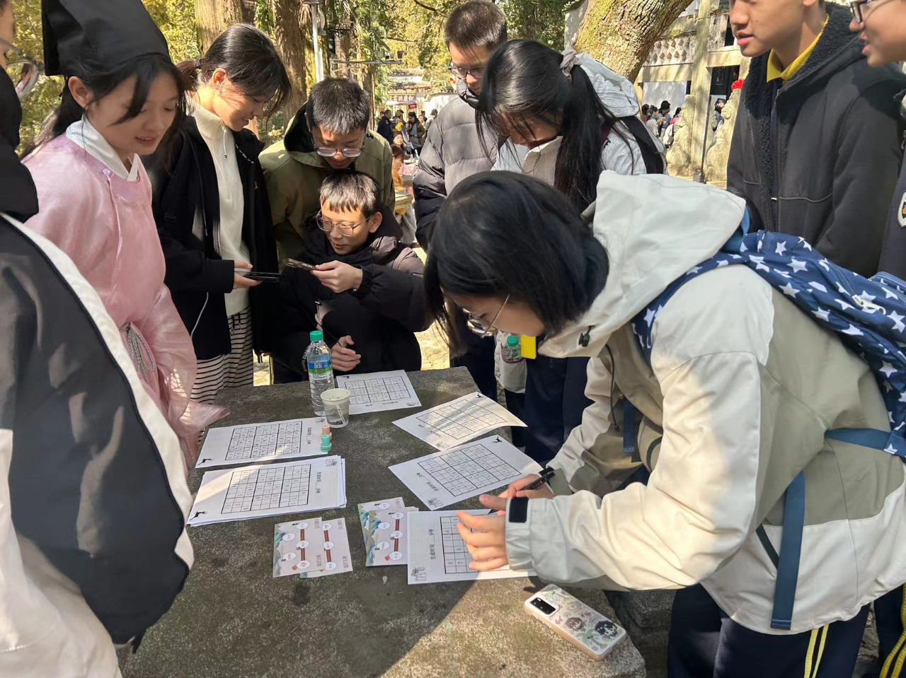 仪式结束后,学生们分组参与了“白鹿六艺”体验活动。古筝体验区,丝弦拨动,清越悠扬的乐章缓缓流淌;岩板拓印环节,学生们细心刷墨、覆纸、拓印,将石刻文字化作手中墨宝;在五子棋和数独对弈中,逻辑思维得到充分锻炼;漆扇制作过程则让大家领略了传统工艺的精巧与色彩之美;传统的投壶游戏让学生在轻松竞技中体会古人的礼仪与娱乐。除了沉浸式体验,学生们还系统地参观了这座古老学府,在讲解中深入了解其历史传承、教育理念以及朱熹等理学大师在此讲学论道的岁月。