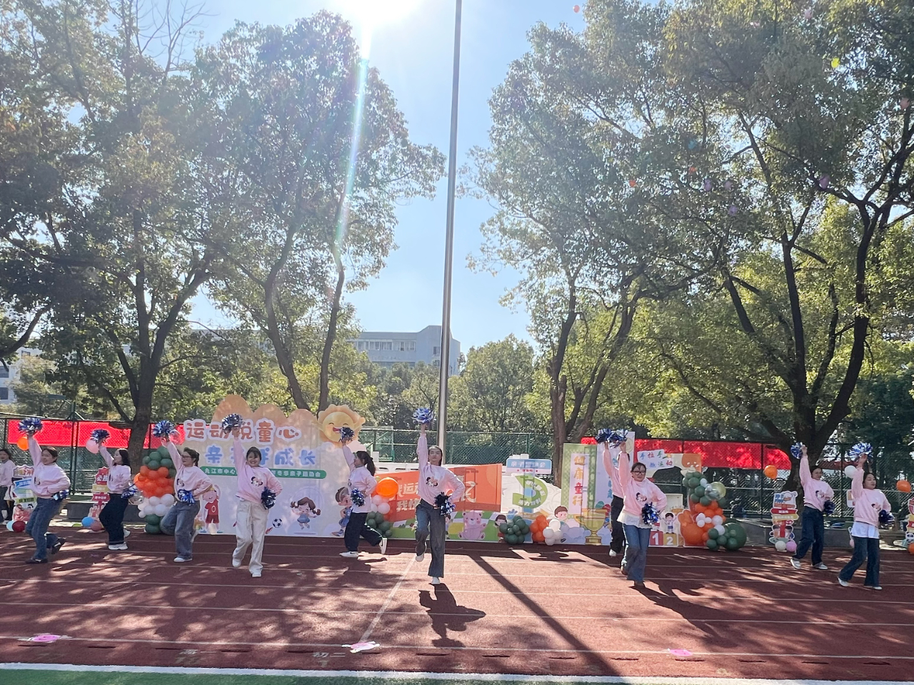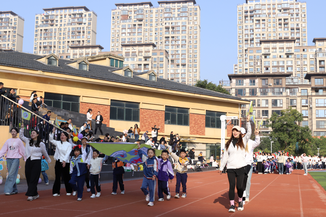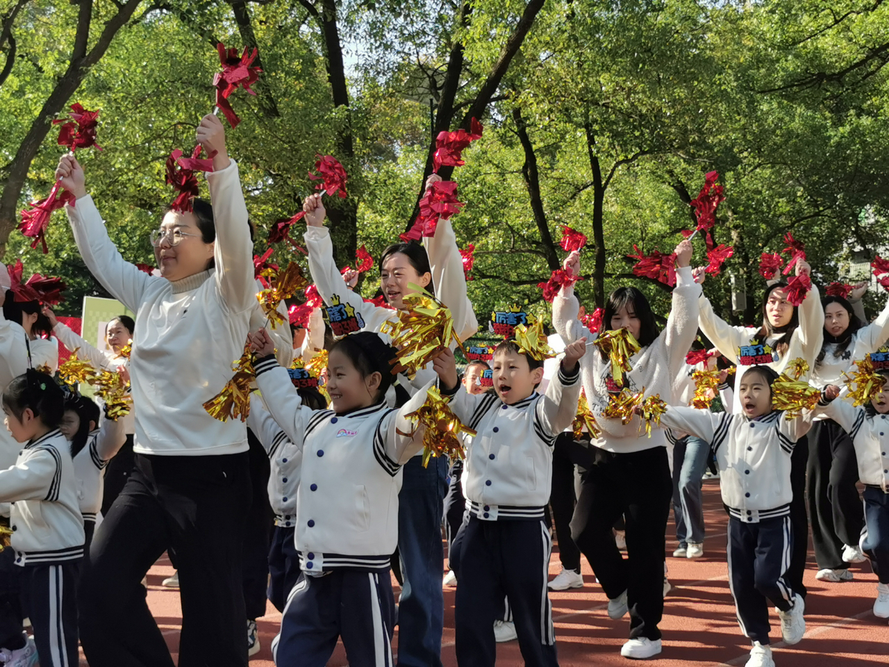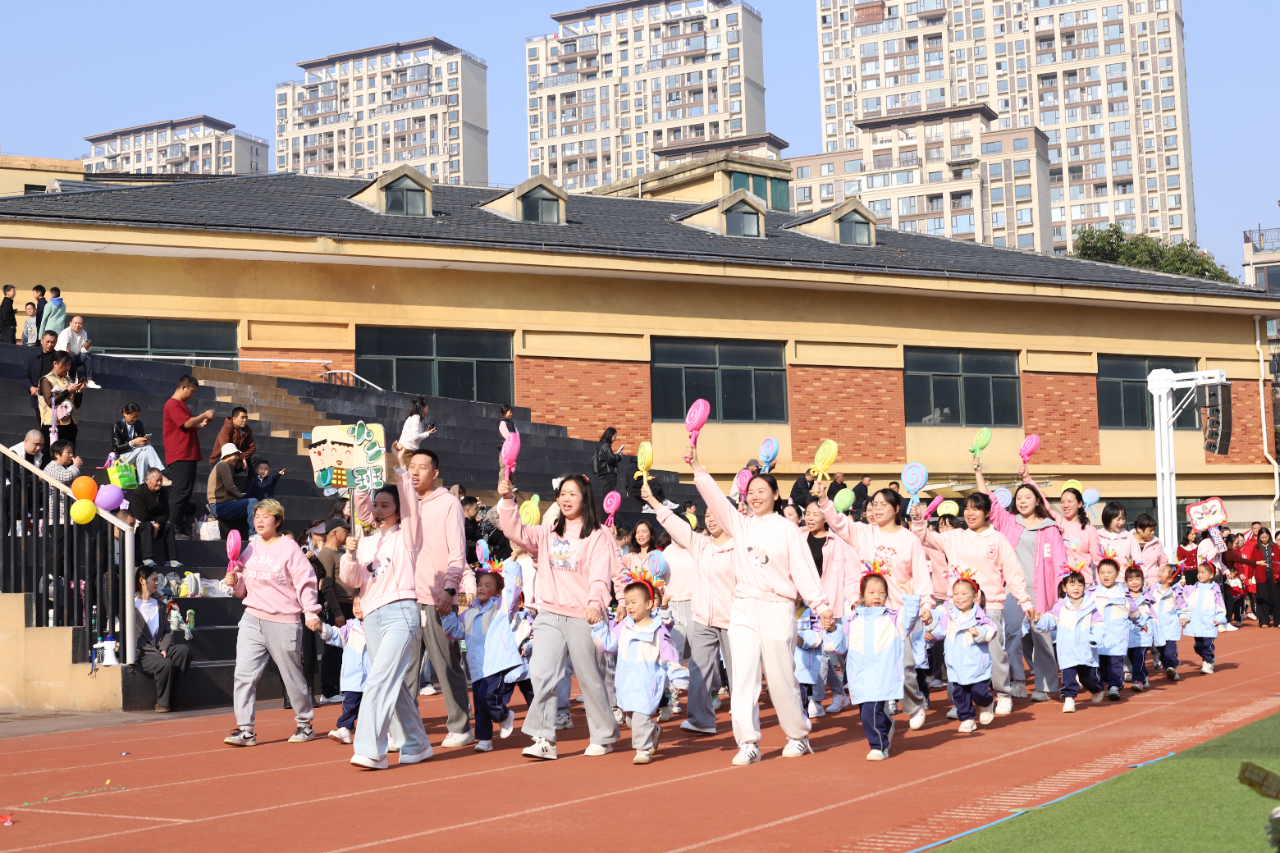 随后,各年级亲子方阵依次登场,孩子们挥舞着彩色花环、卡通手举牌等,与家长们一同喊出响亮的班级口号。接下来,伴随着欢快的音乐,孩子们牵着家长的手一起律动,或弯腰互动或牵手旋转,每一个动作都满是默契与温情。
