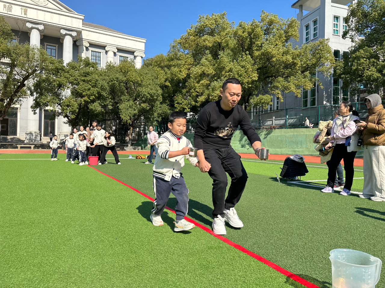 比赛环节趣味十足、高潮迭起。单项亲子游戏中,“蜗牛赛跑”“小猴运瓜”“齐头并进”等项目贴合幼儿年龄特点,孩子们在家长的陪伴下奋勇争先,家长们也仿佛回到了童年,现场笑声、欢呼声不断。团体赛“毛毛虫传球”“小蛇扭扭”“运水接力赛”更是点燃了全场热情,亲子家庭齐心协力、默契配合,为了班级荣誉奋力拼搏。加油声、呐喊声此起彼伏,赛场上充满了欢声笑语与温暖力量。