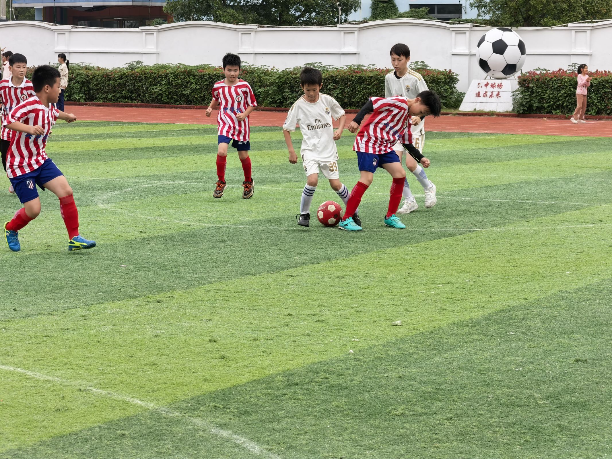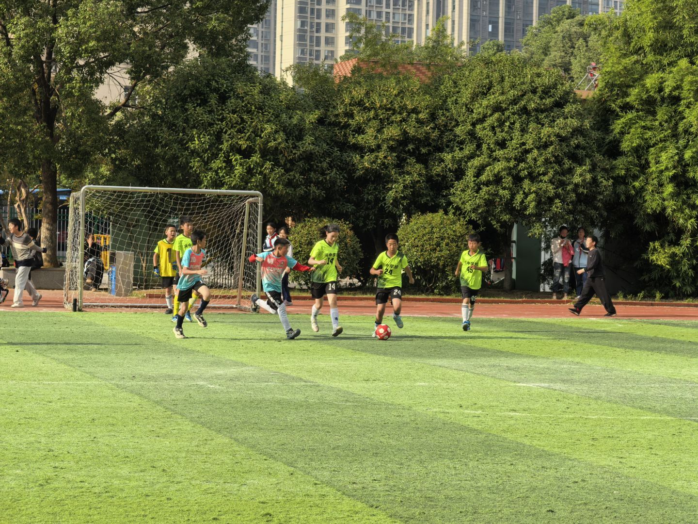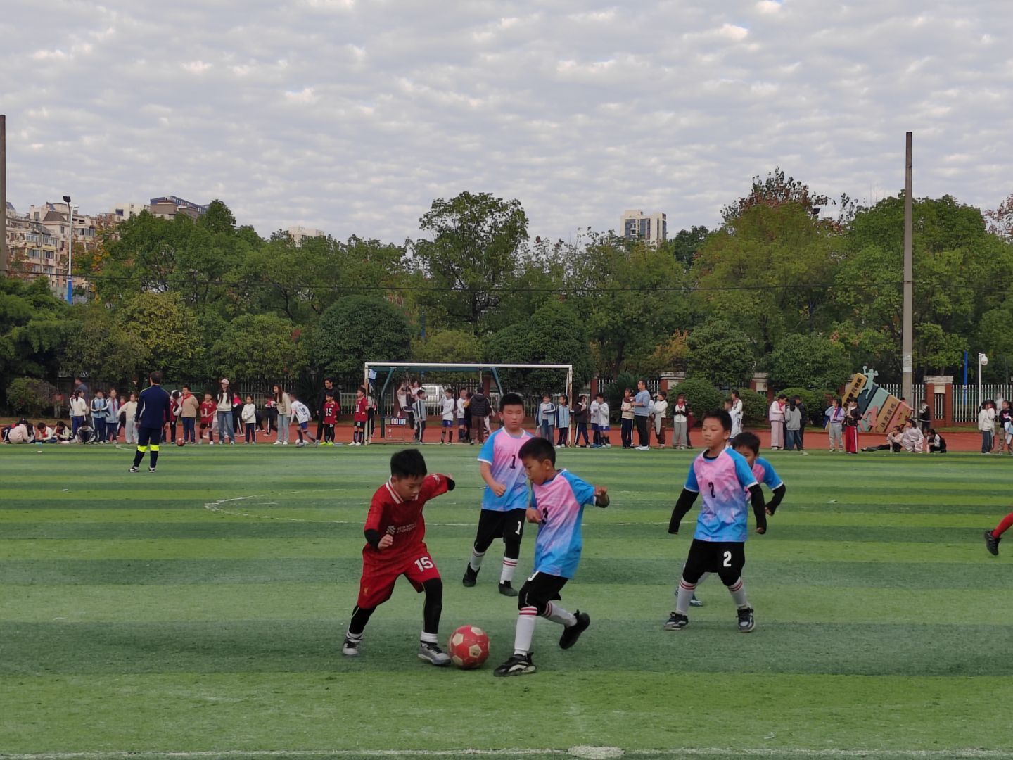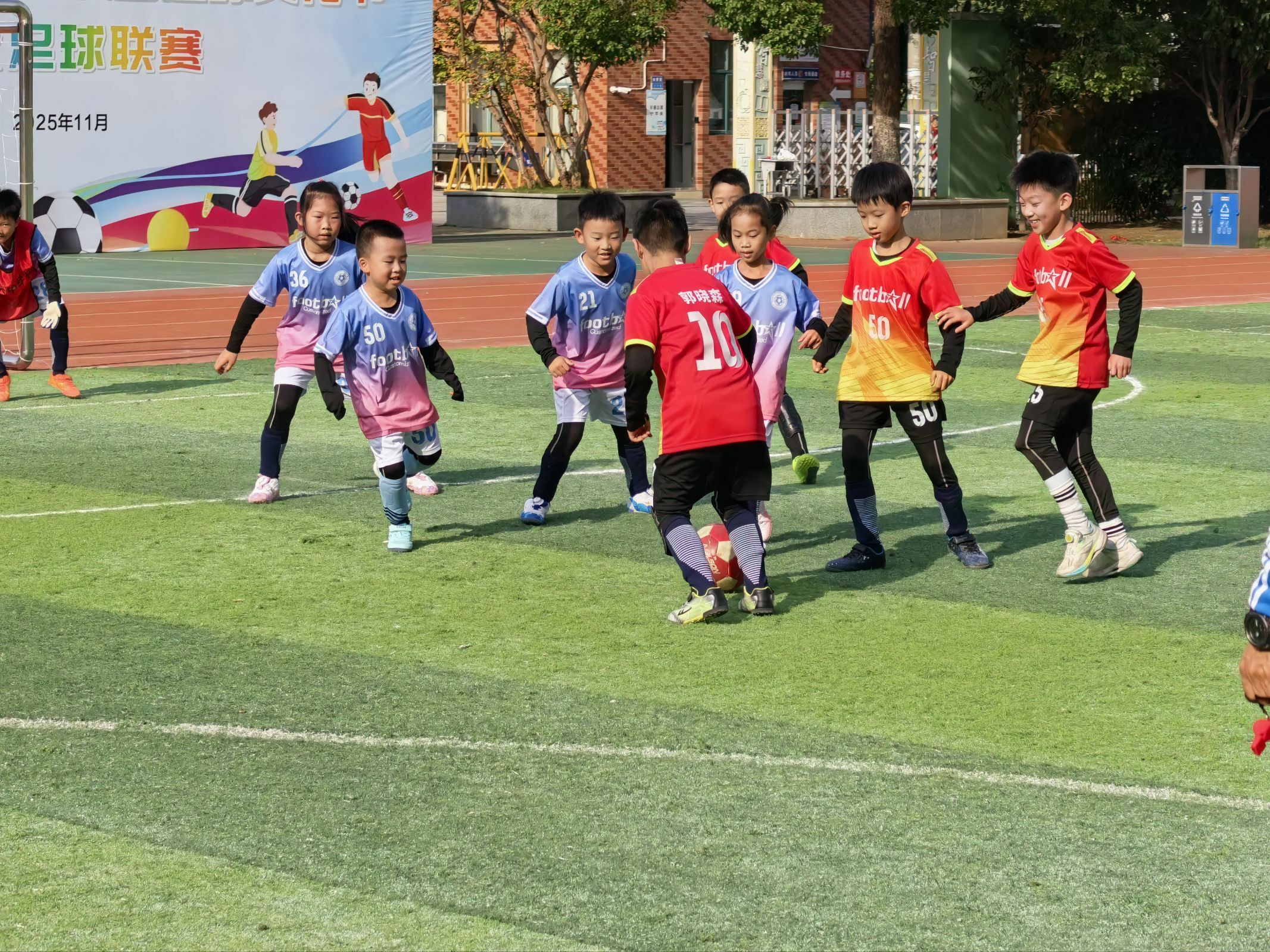 联赛阶段,各班级球队展开激烈角逐。赛场上,小球员们默契配合、奋勇争先,精准的传球、迅猛的突破、精彩的射门引得场边观众阵阵欢呼。有的班级球队凭借严密防守与灵活战术一路过关斩将,有的球队虽实力稍逊却坚持到最后一刻,用汗水诠释“永不言弃”的体育精神。场外,班级啦啦队呐喊声此起彼伏,成为球员最坚实的后盾,展现出极强的班级凝聚力。