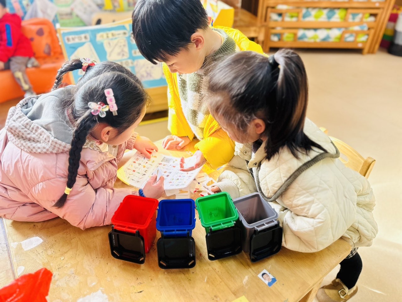 在“送垃圾宝宝回家”的游戏中,孩子们手持各种垃圾卡片,兴高采烈地奔跑着,仔细辨别后,将它们准确无误地投放到迷你分类桶中。当听到“答对啦!”的鼓励时,一张张小脸上洋溢着自豪与喜悦。通过亲身体验,孩子们明白了:废旧纸张、塑料瓶是可回收的“宝贝”;果皮、剩菜剩饭可以变成滋养土地的肥料;废旧电池、过期药品是需要特殊处理的“有害物品”。