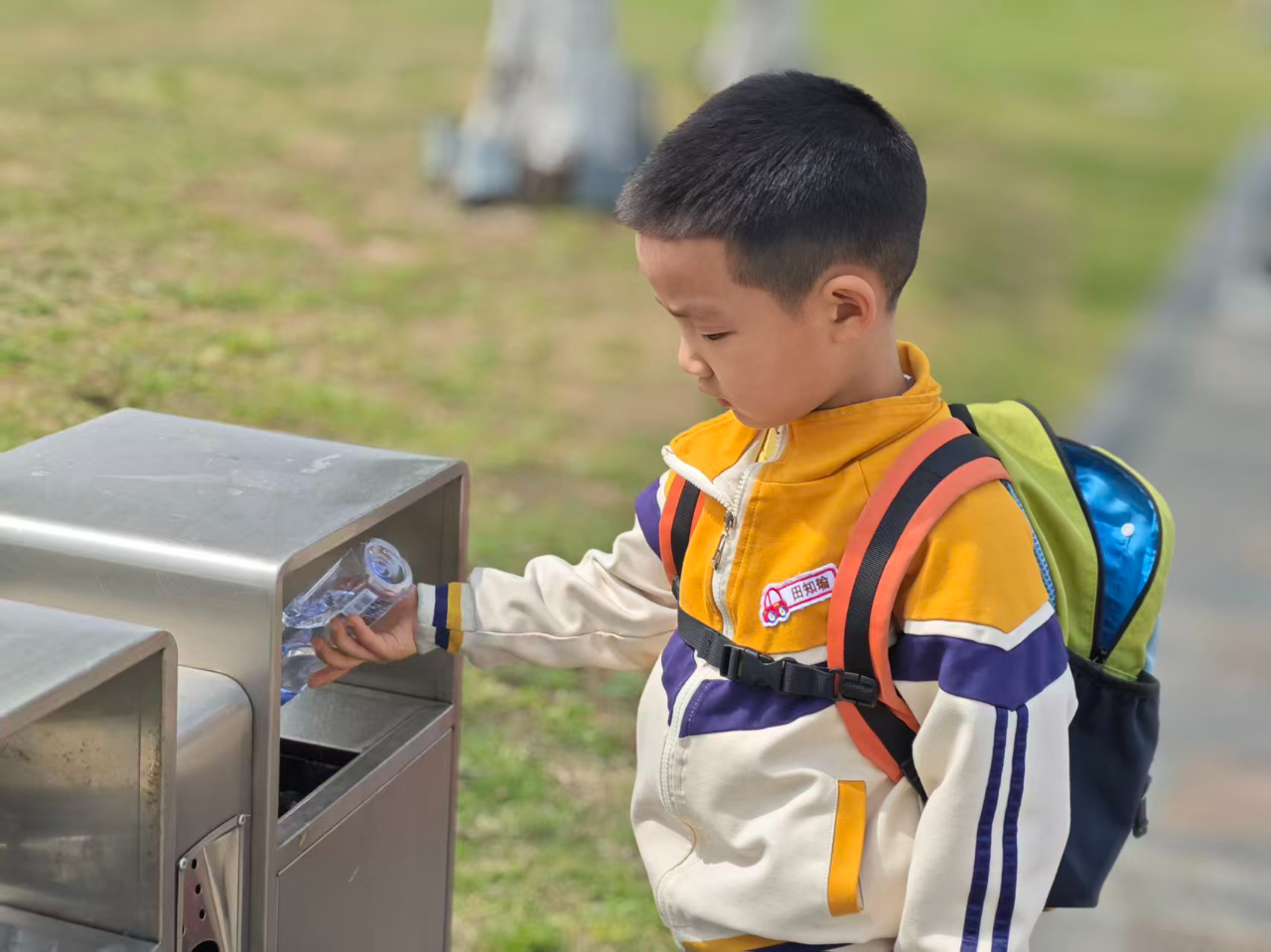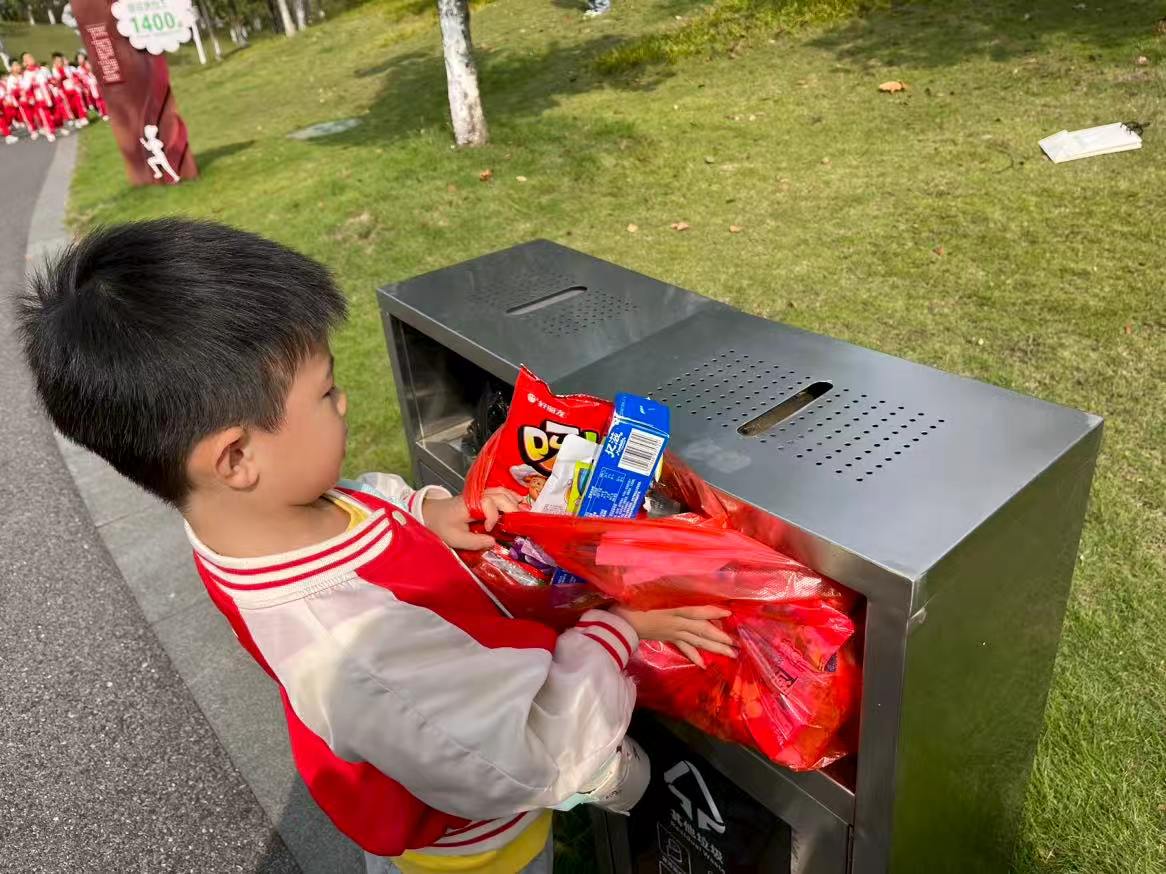 接着,在老师的带领下,孩子们化身小小行动员,用自己的行动践行垃圾分类。他们在户外将不同的垃圾准确地投放到不同的垃圾桶里。在亲身体验和实际操作中,孩子们巩固了垃圾分类知识,也让绿色理念在行动中生根发芽。