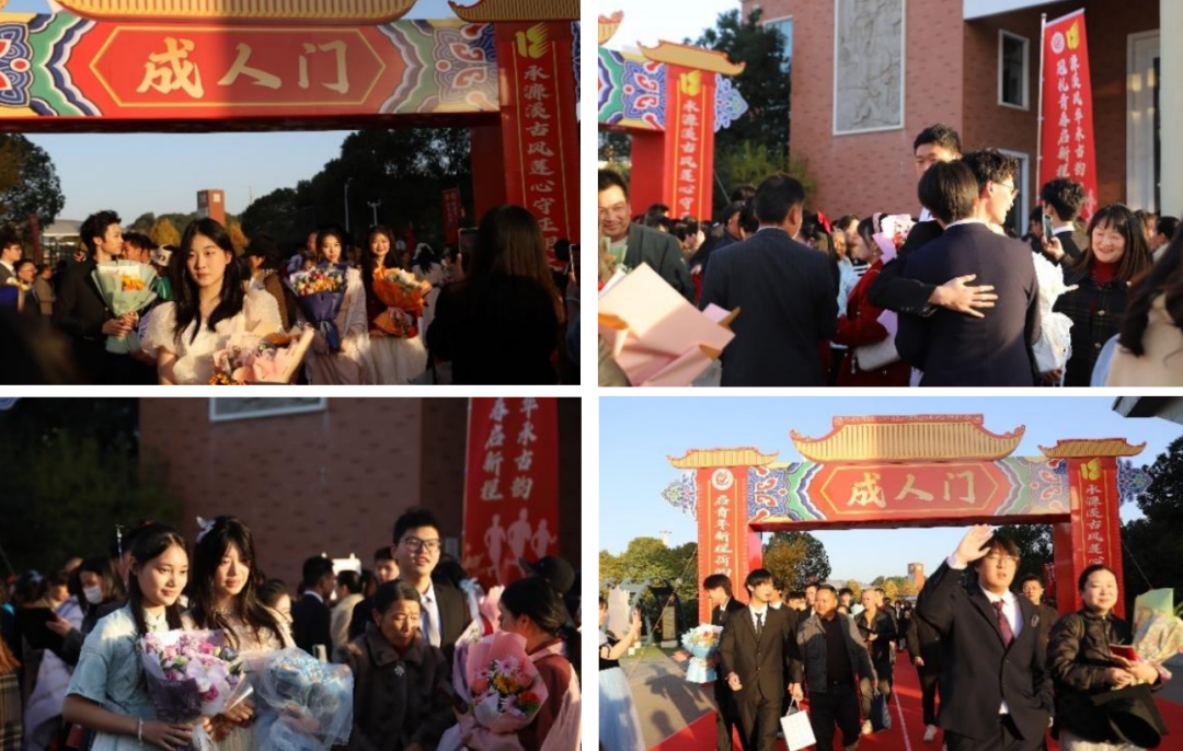 在温馨感人的氛围中,家长们为孩子佩戴上象征成年的成人帽,并递上精心准备的礼物,双方以拥抱相互致意。随后,全体学生怀揣感恩之心,面向父母、老师及到场嘉宾庄重地行三鞠躬礼,以此感谢父母的养育之恩、老师的教诲之德及社会各界的关怀与支持。现场气氛庄重而温馨,充满了成长与感恩的动人情感。