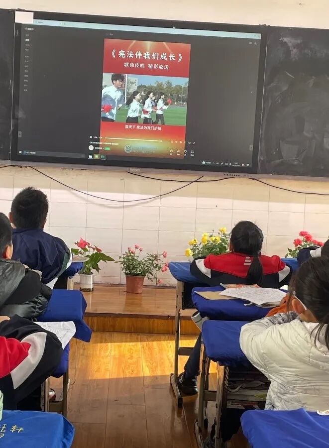 直播结束后,各班紧接着开展班级“宪法晨读”活动。班主任结合图示内容,引导学生深入学习宪法核心内容,进一步理解宪法与日常生活的紧密联系。随后,全体学生齐唱《宪法伴我们成长》,激昂的旋律、真挚的歌声传递出同学们对宪法的尊崇与热爱,将活动氛围推向高潮。