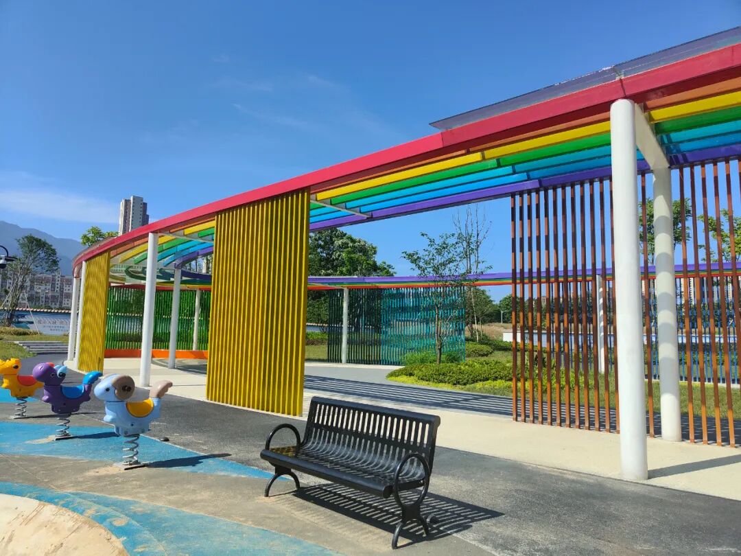 园内最吸睛的当属 “七色” 彩虹廊架,宛若缠绕在绿意间的彩色丝带,随手拍都是清新大片。这里绿植繁茂,行走其间满是清新空气,更贴心配备了亲水台阶、车行桥、人行拱桥,儿童游乐设施也一应俱全,无论是家长带娃玩耍,还是市民日常休闲散步,都能找到舒适的放松方式。