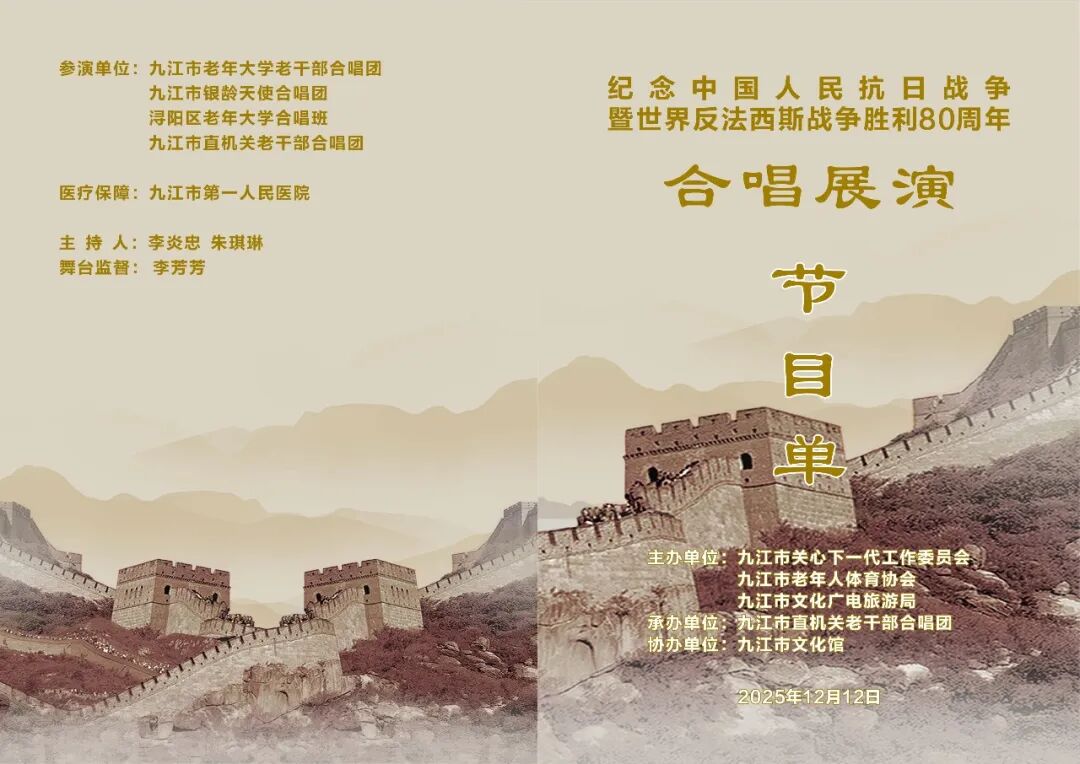 2025年12月12日下午3点,在九江市文化艺术中心小剧场将举办一场以“声动浔阳抗战回响”为主题的合唱展演活动。此次活动由九江市关心下一代工作委员会、市老年人体育协会、市文化广电旅游局联合主办,市直机关老干部合唱团承办,市文化馆协办。活动旨在纪念中国人民抗日战争暨世界反法西斯战争胜利80周年,深切缅怀抗战先烈,弘扬伟大抗战精神,为九江发展激发奋进力量。