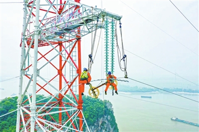 工人在棉船风电项目110千伏配套线路跨长江放线作业。(彭琴 九江日报全媒记者 欧阳海员 摄)