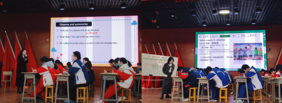 活动中,柴桑区第一中学李馨仪老师的《读后续写微技能之动作描写》观摩课设计层层递进,从动词到场景,扎实提升学生写作基本功。李碧秋老师则以“How to Vividly Describe a Football Match”为课题,巧妙运用AR技术营造沉浸氛围,结合本地赛事视频与A-R-E教学模式,引导学生通过“故事山”结构梳理逻辑,课堂互动热烈,充分展现了学校教师在新课标理念与技术创新融合方面的积极探索与实践成效。