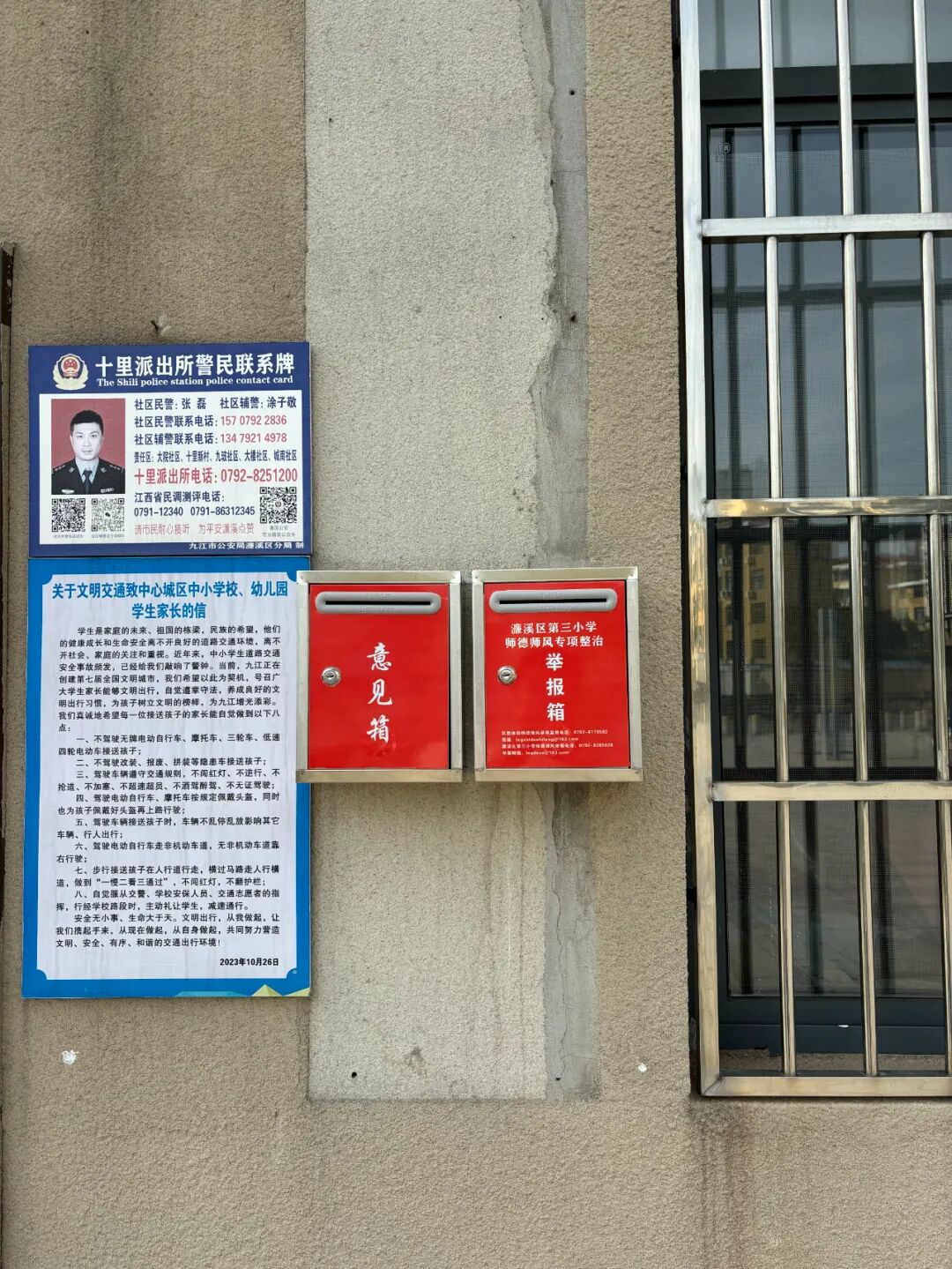 2. 师德师风专项整治举报箱:专项接收与师德师风相关的举报线索,箱体标注区教体局师德师风举报监督电话、学校师德师风举报电话及举报邮箱,方便家长同步通过电话、邮箱反馈相关问题。