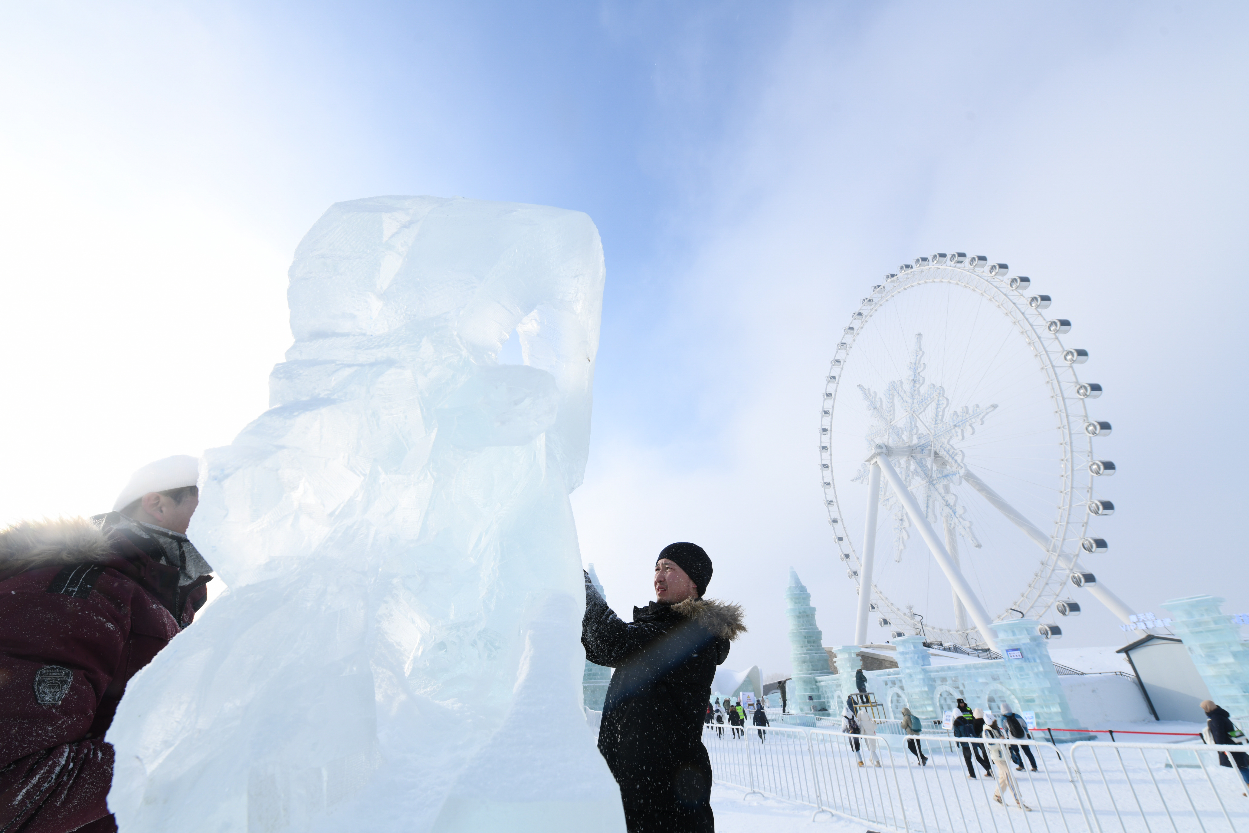 2024年1月3日,参赛选手在哈尔滨冰雪大世界进行的第35届中国·哈尔滨国际冰雕比赛中进行冰雕创作。比赛有来自世界各地的30余支代表队参赛。