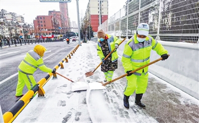1月20日一早,环卫工人在城市道路上及时扫雪除冰。(九江日报全媒记者 周慧超 摄)
