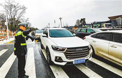 1月20日,交警在庐山索道冒雪执勤,疏导车流。(九江日报全媒记者 洪显智 摄)