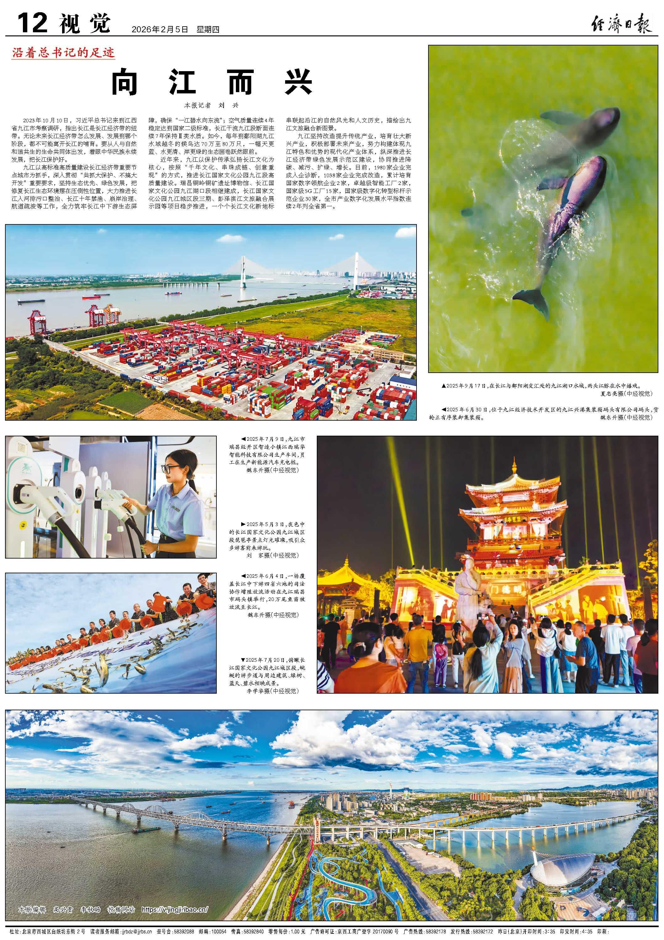 2月5日,经济日报刊发整版图文稿件《向江而兴》,报道九江牢记嘱托、感恩奋进,以高标准高质量建设长江经济带重要节点城市为抓手,深入贯彻“共抓大保护、不搞大开发”重要要求,坚持生态优先、绿色发展,全力筑牢长江中下游生态屏障,推进长江国家文化公园九江段高质量建设,努力构建体现九江特色和优势的现代化产业体系。