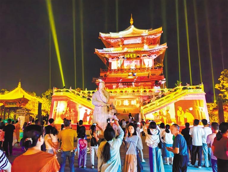 2025年5月3日,夜色中的长江国家文化公园九江城区段琵琶亭景点灯光璀璨,吸引众多游客前来游玩。