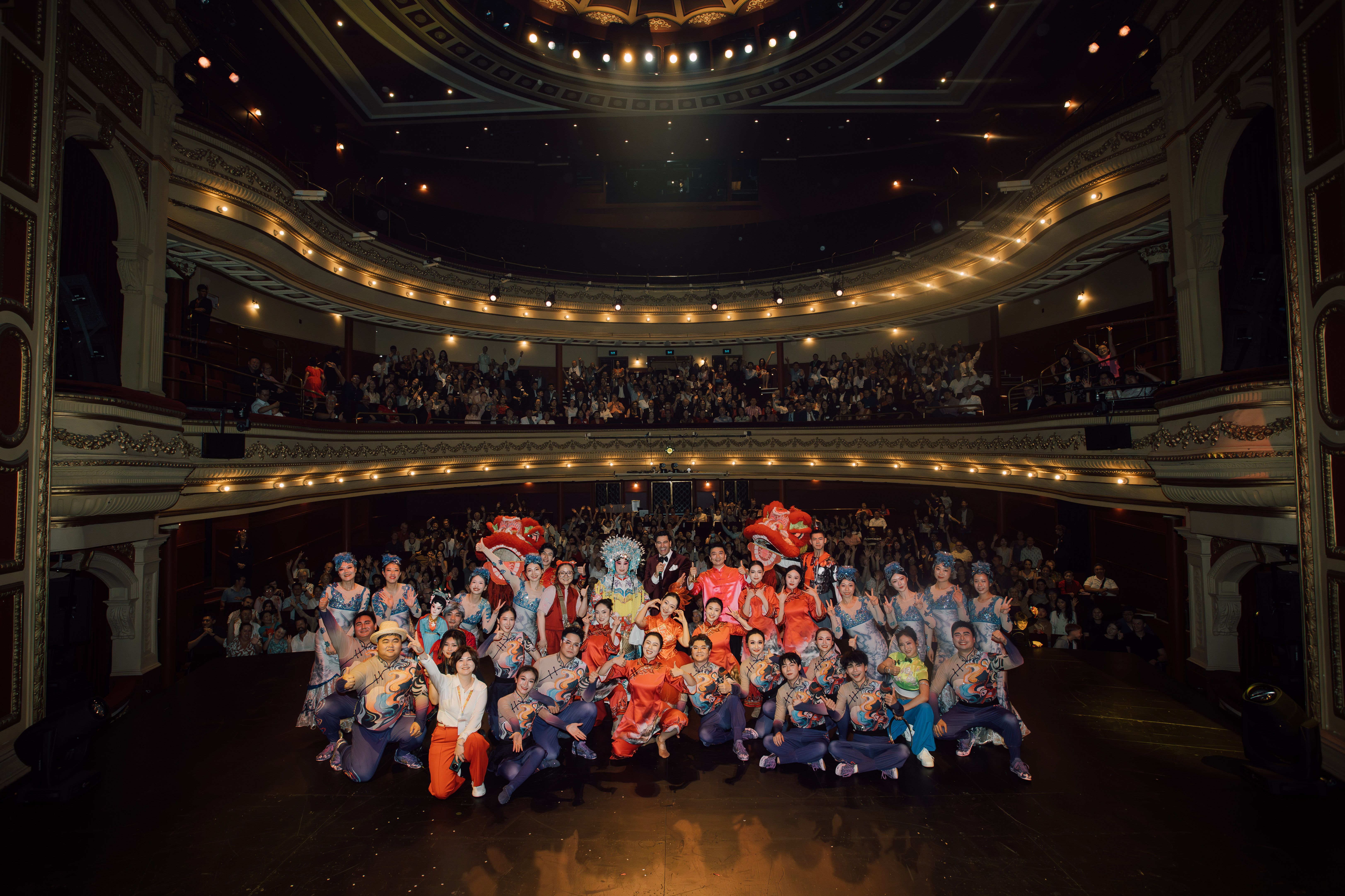 随着锣鼓声响起,开场节目《华彩西澳迎新春》瞬间点燃全场气氛。舞龙翻腾、雄狮跃动,表演者们手持灯笼与春联载歌载舞,将整个剧场化作一派喜气洋洋的“新春集市”。浓郁的中国年味儿扑面而来,现场观众纷纷举起手机记录这一精彩时刻,掌声与欢呼声此起彼伏。