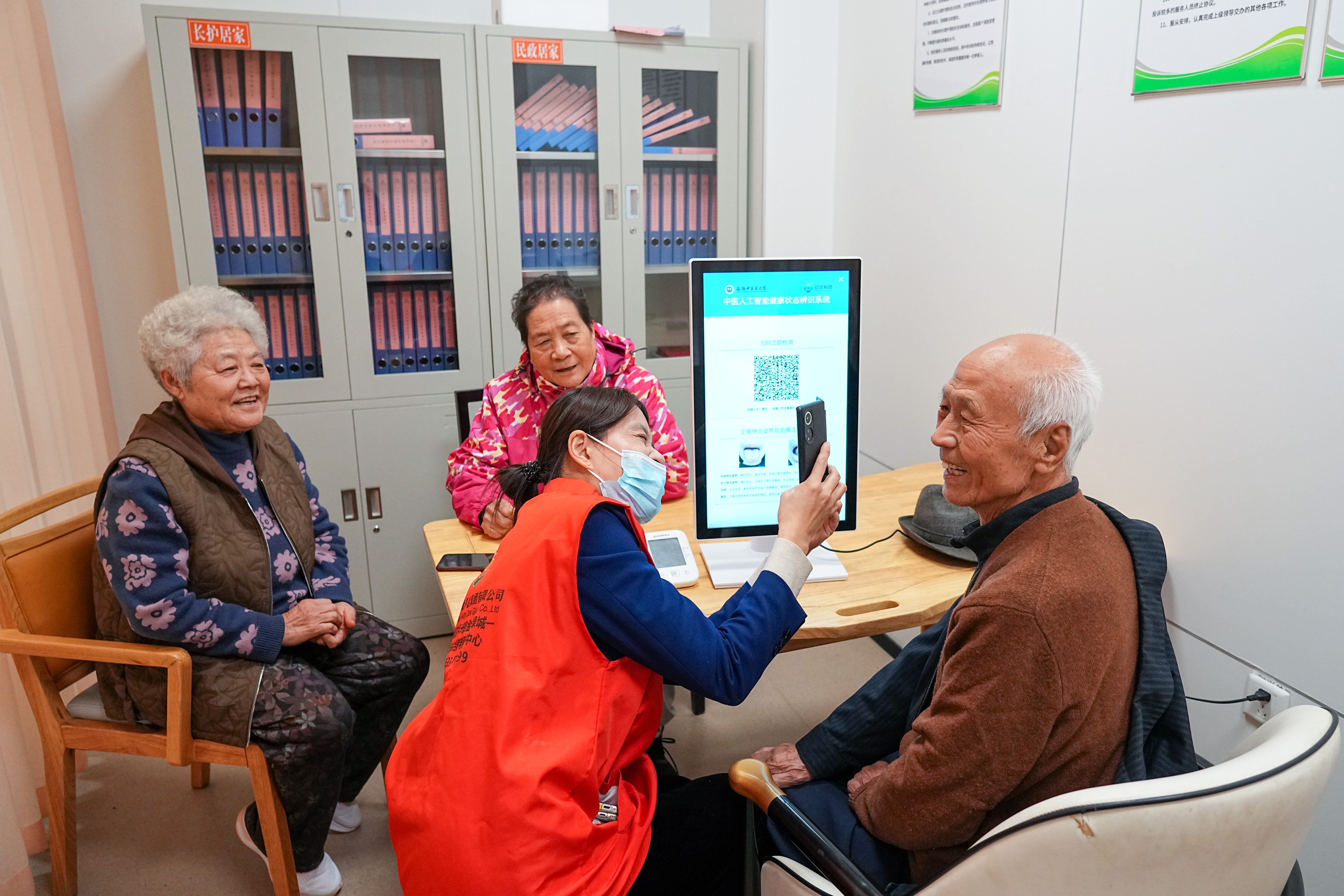 2025年10月23日,老人在山东省淄博市张店区马尚街道金石社区日间护理中心测量健康数据。新华社记者 朱峥 摄