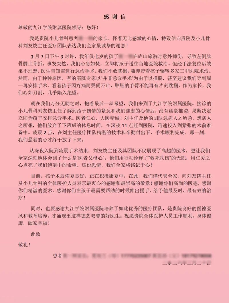 九江新闻网讯 “万分无助之时,抱着最后一丝希望,我们来到了九江学院附属医院。从深夜入院到凌晨手术结束,附院医护不仅展现了高超的医术,更用行动诠释了‘救死扶伤’的天职,这份恩情,我们铭记于心!”近日,一名7岁患儿因骨折在医院治疗,其家属发来感谢信,表达了对运动损伤与小儿骨科刘友饶主任团队的由衷赞扬,并对医院良好的医德医风表示高度认可。