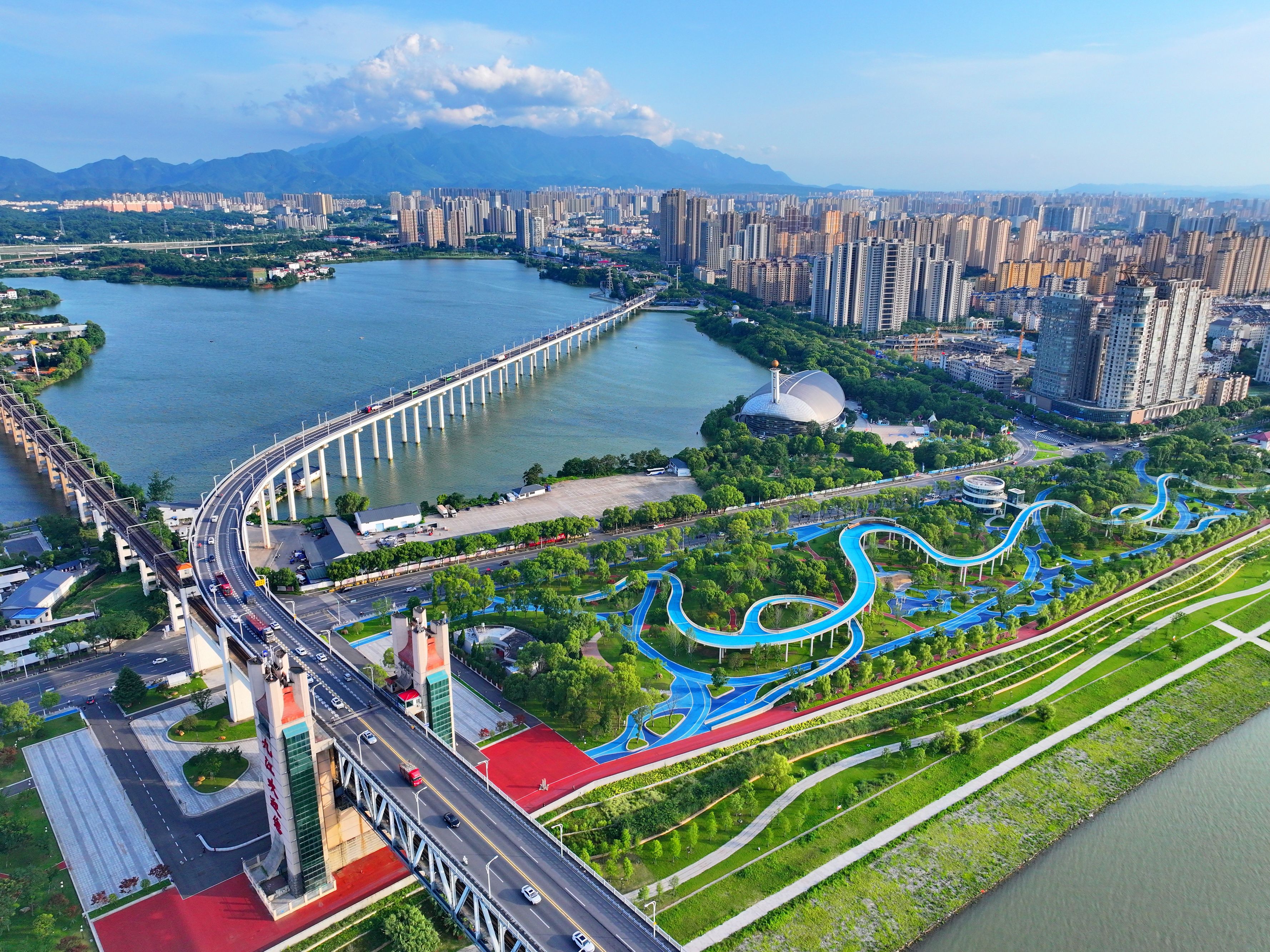 长江国家文化公园九江城区段,蜿蜒的游步道与周边建筑、绿树、碧水以及巍峨的庐山相映成景。朱海鹏摄