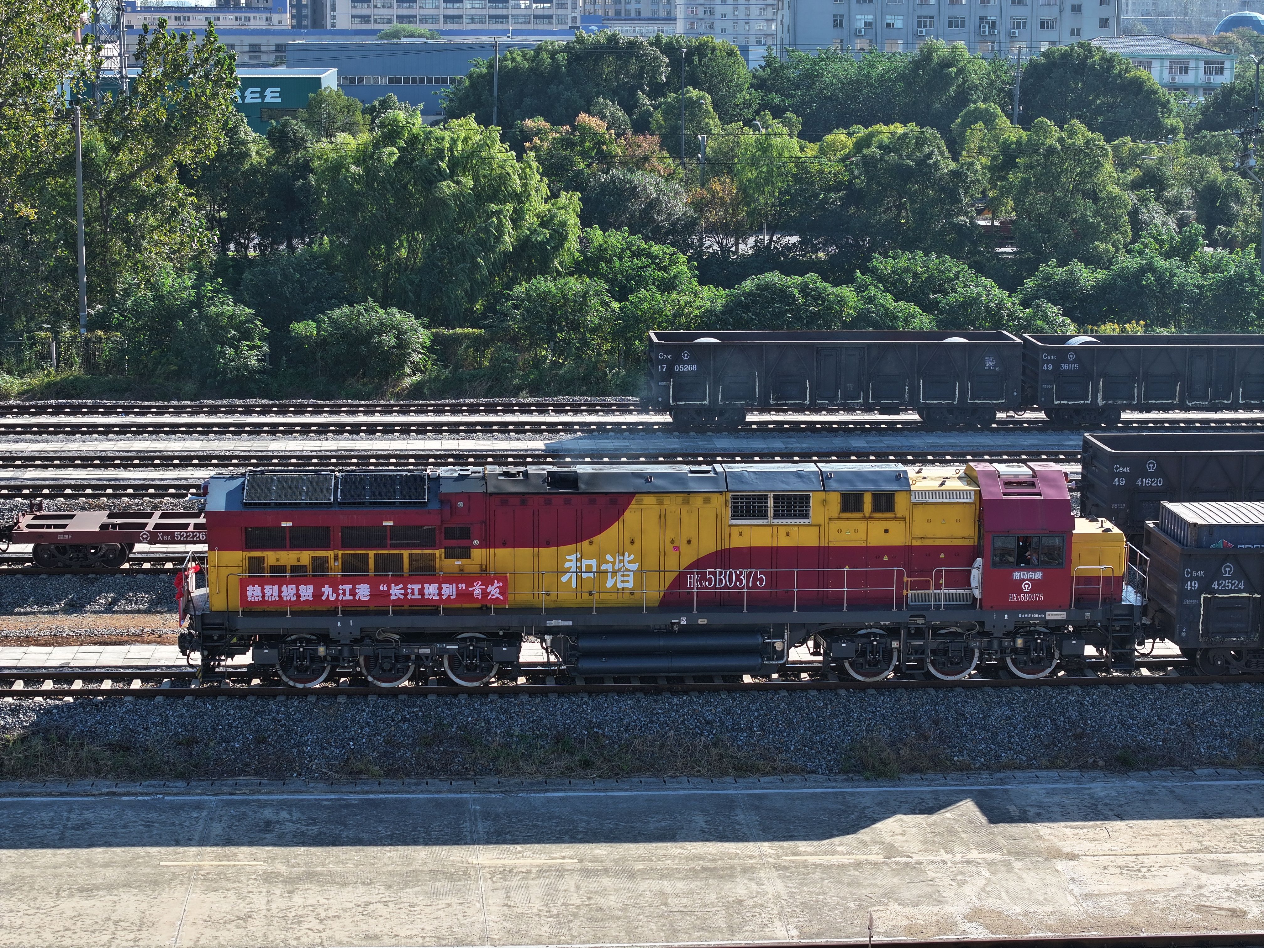 一列满载玉米的“长江班列”从江西九江城西港铁路专用线上港作业区缓缓驶出。 吴颖摄