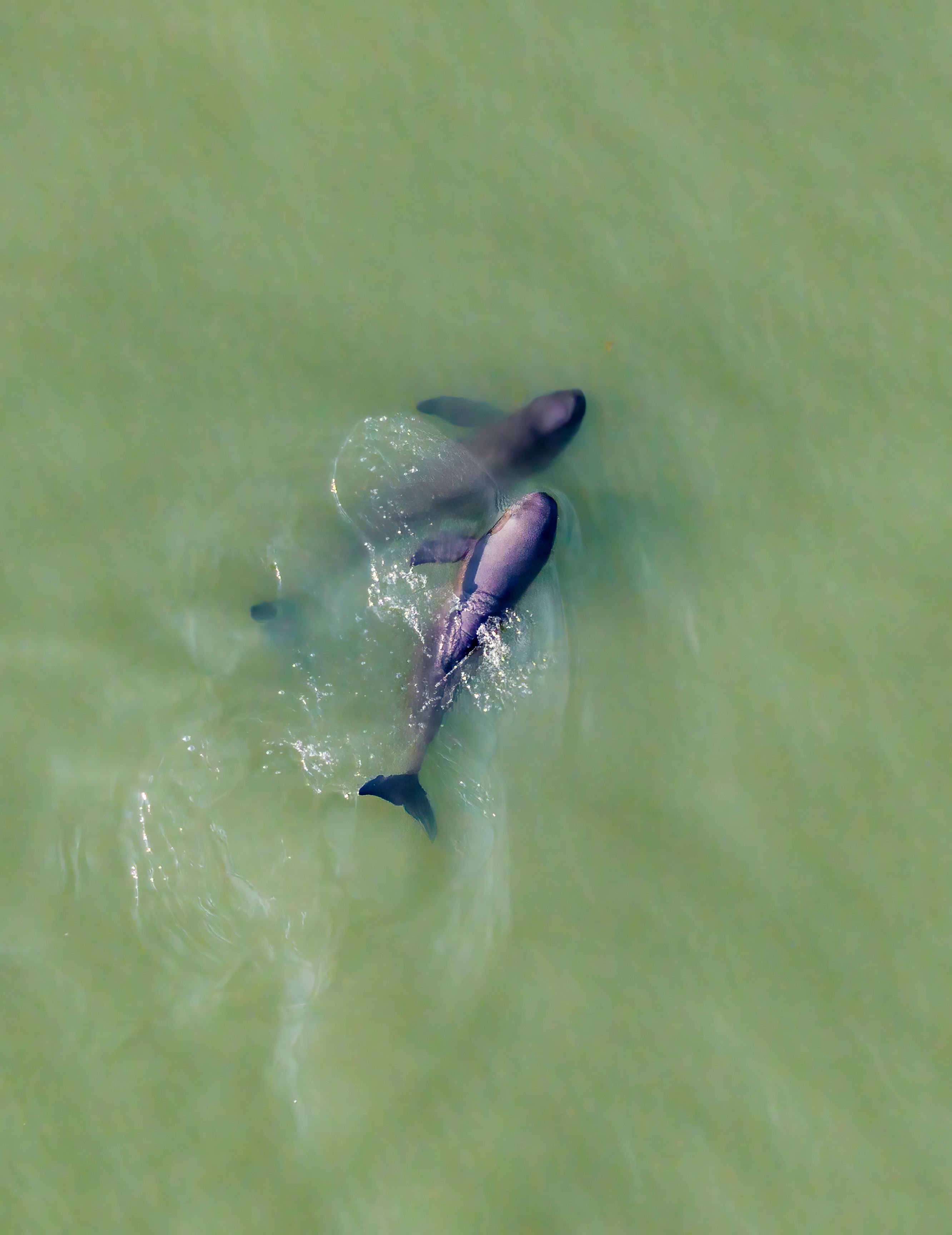 在长江与鄱阳湖交汇处的九江湖口水域,两头江豚在水中嬉戏。 夏忠亮摄