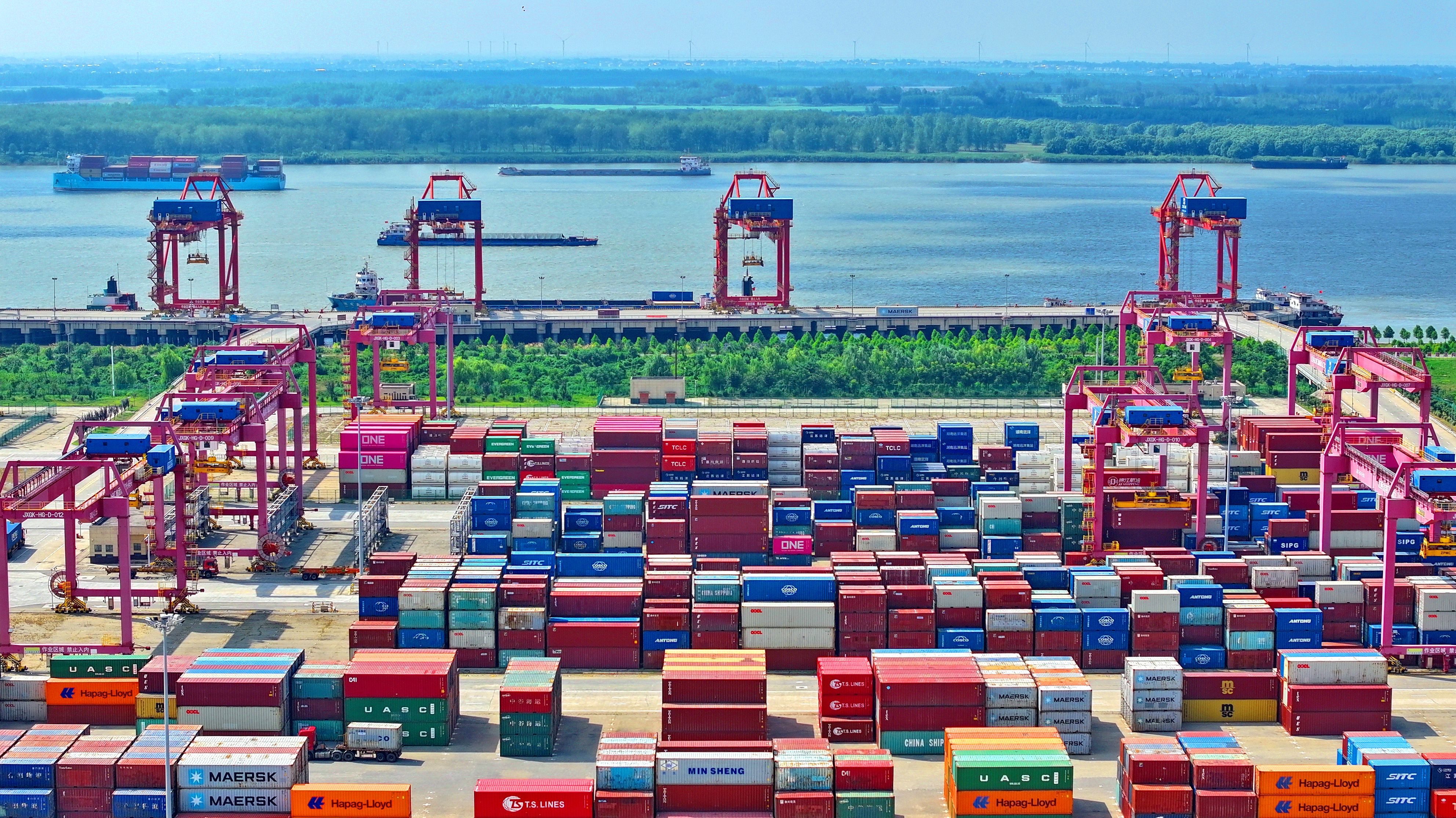 位于彭泽县的九江红光国际港,集装箱装卸作业有序进行。朱海鹏摄