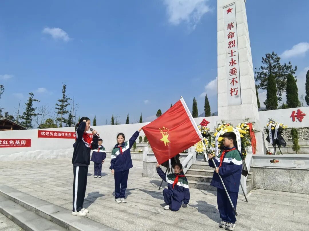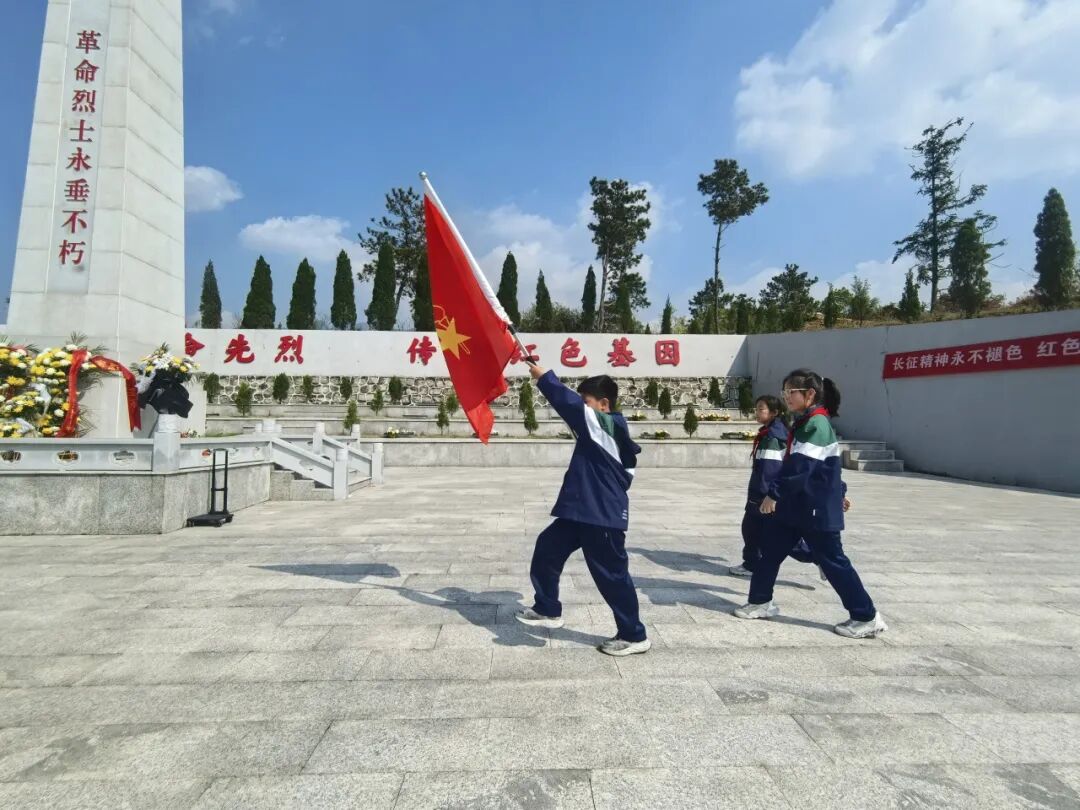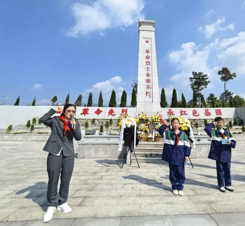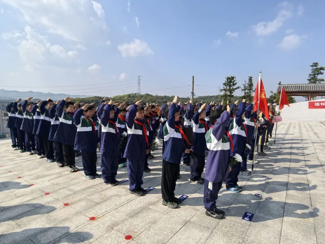 随着国歌声奏响,全体师生齐声高唱,嘹亮的歌声在陵园上空回荡,诉说着对祖国的赤诚。随后,少先队员们齐声献唱《中国少年先锋队队歌》。