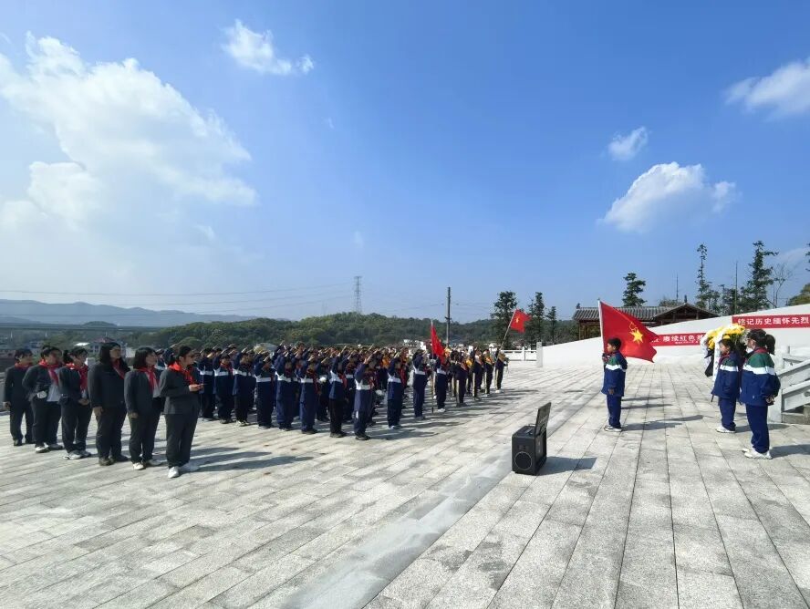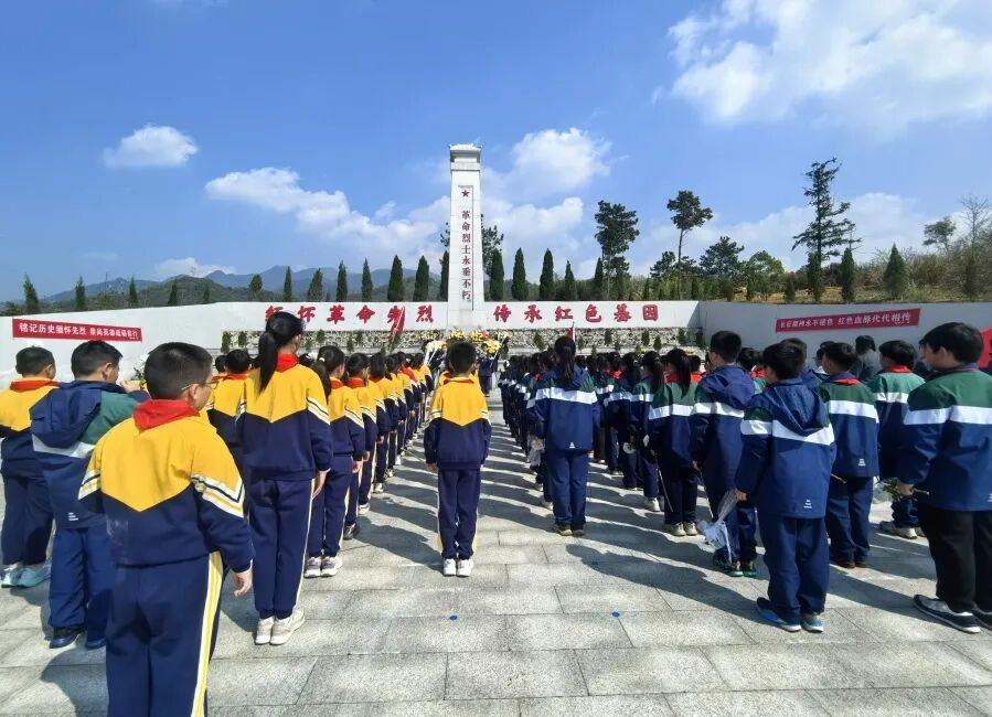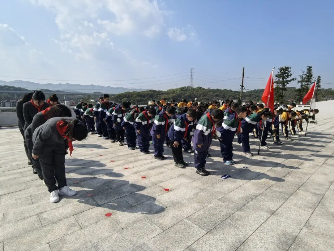 少先队员代表向烈士纪念碑敬献花篮。全体师生向烈士行三鞠躬礼,默哀一分钟。