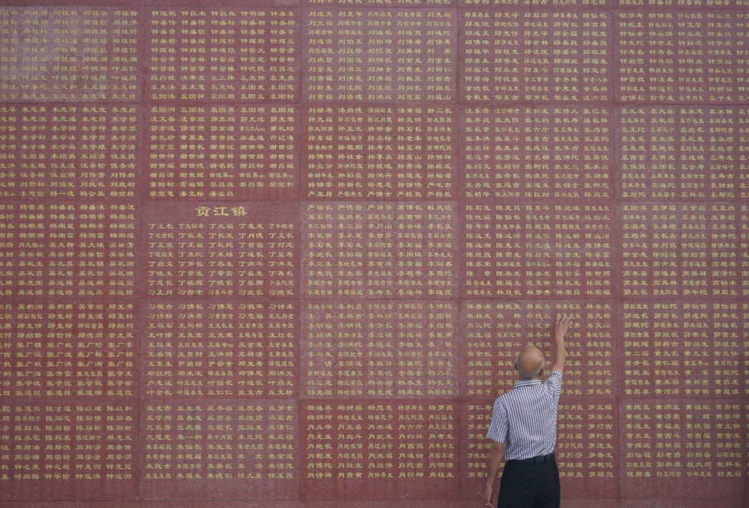 红军烈士后代在江西于都烈士纪念园英名墙前,缅怀革命英烈。新华社记者 赖星 摄
