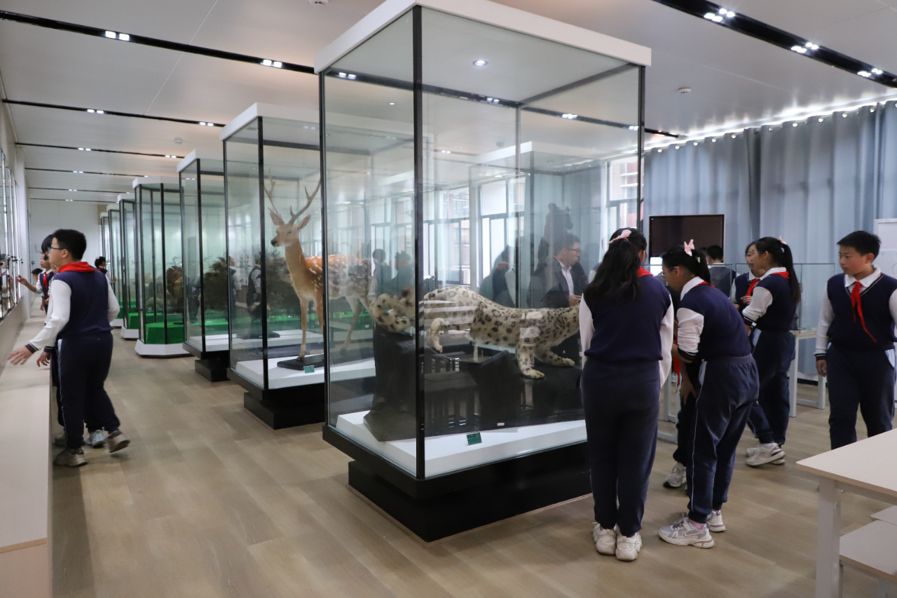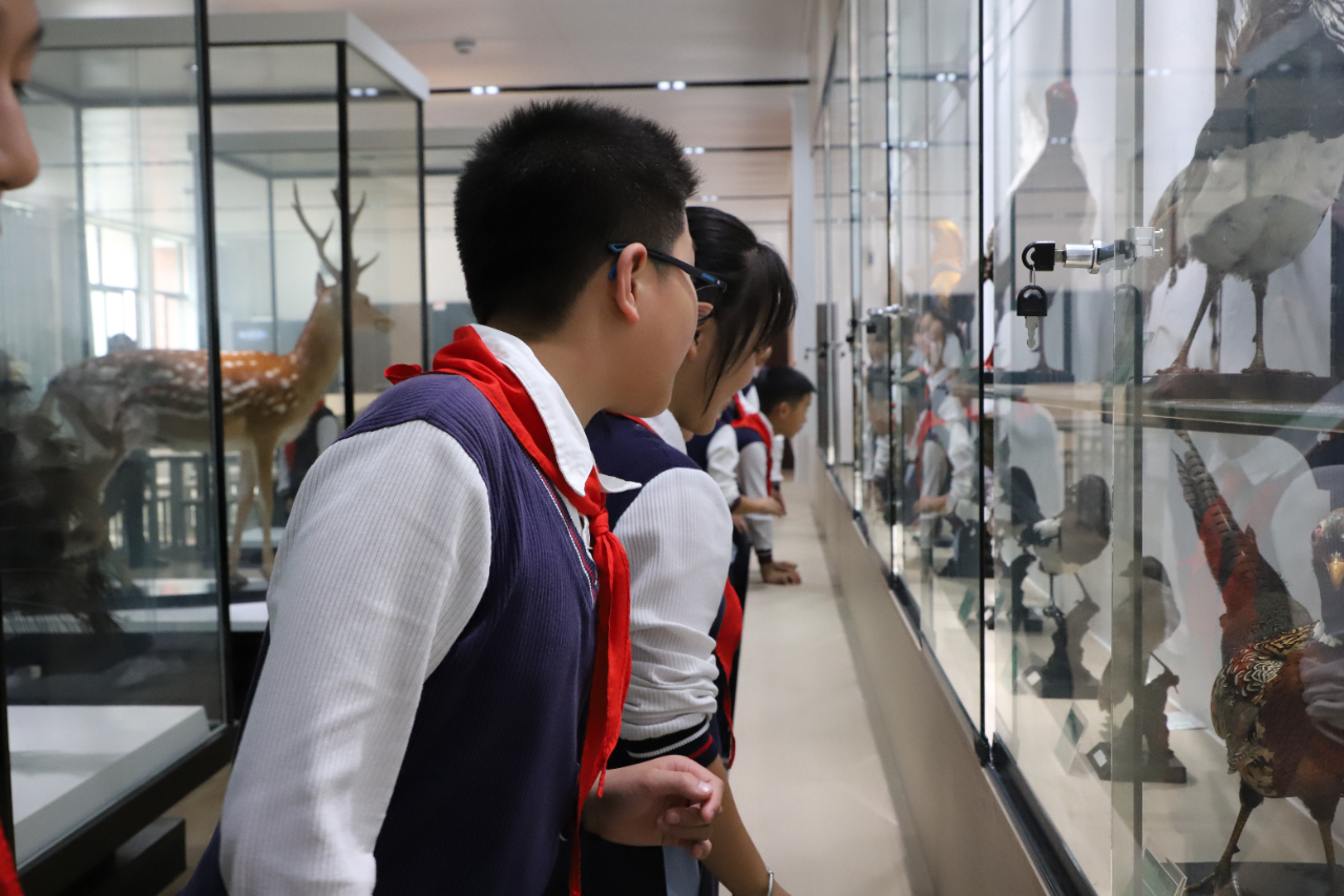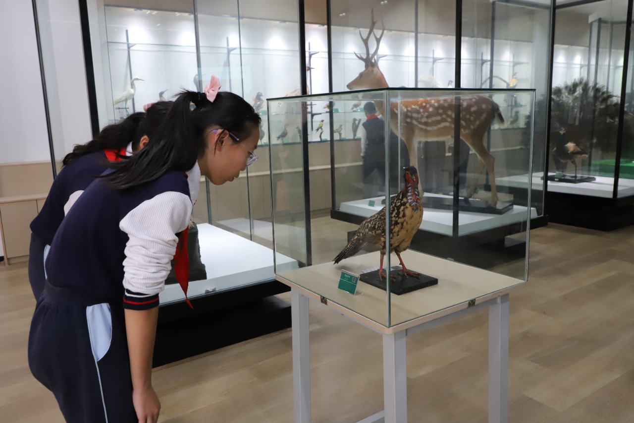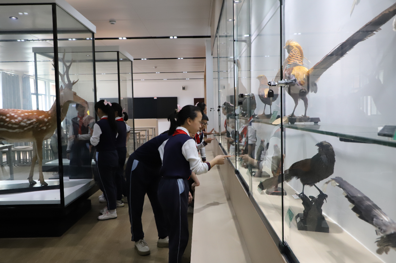 在生物标本展览室,同学们被种类繁多、制作精美的动物标本所深深吸引。他们认真聆听讲解,仔细观察各类标本的形态特征,不时发出阵阵惊叹,并就自己感兴趣的问题与指导老师进行交流,展现出强烈的求知欲和细致的观察力。