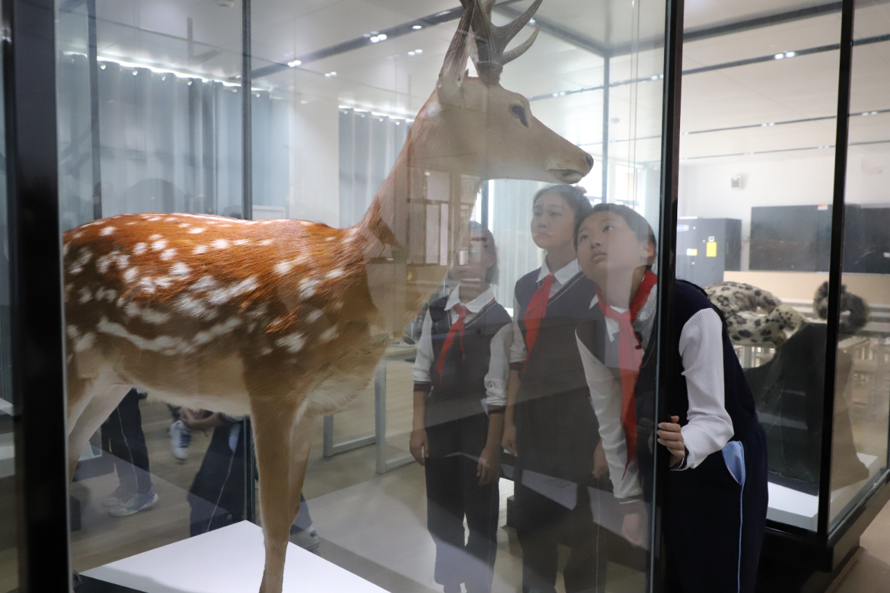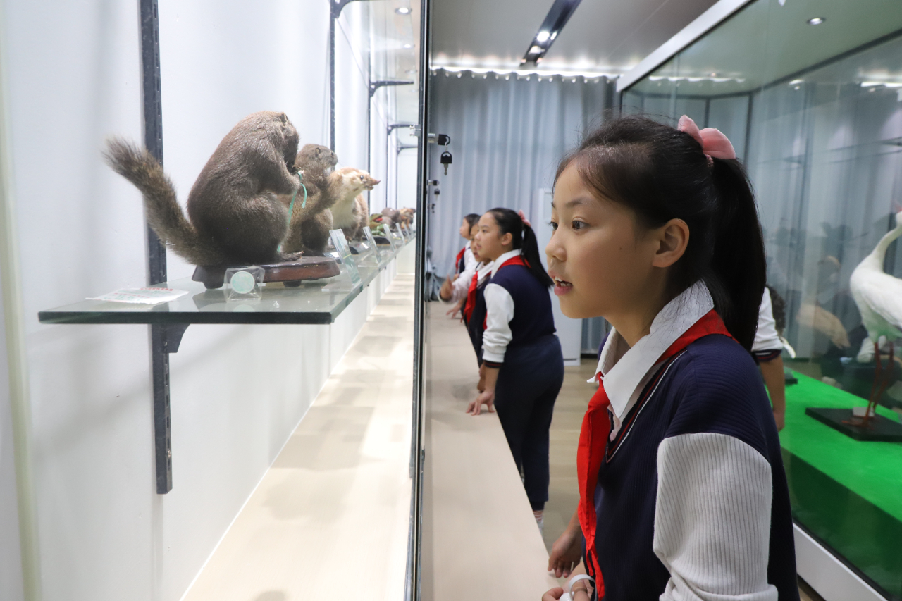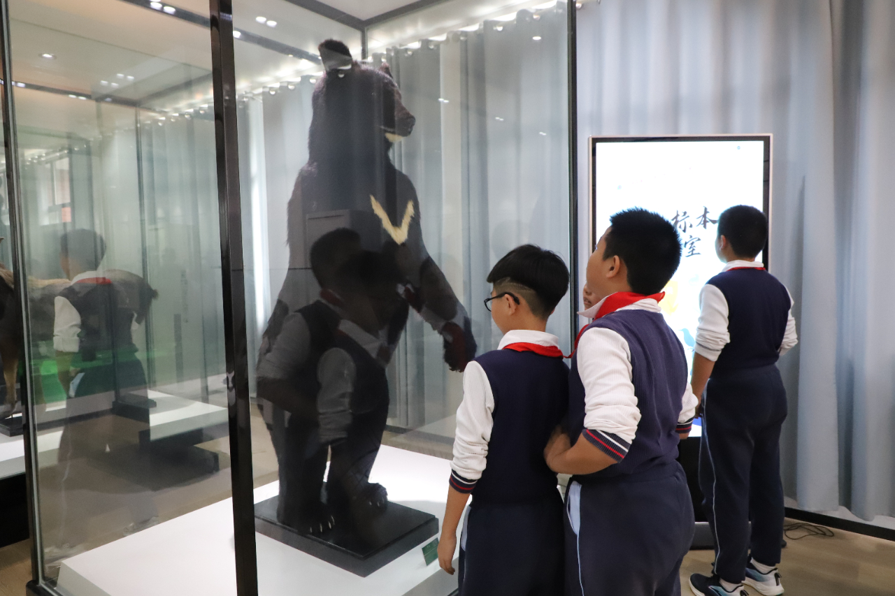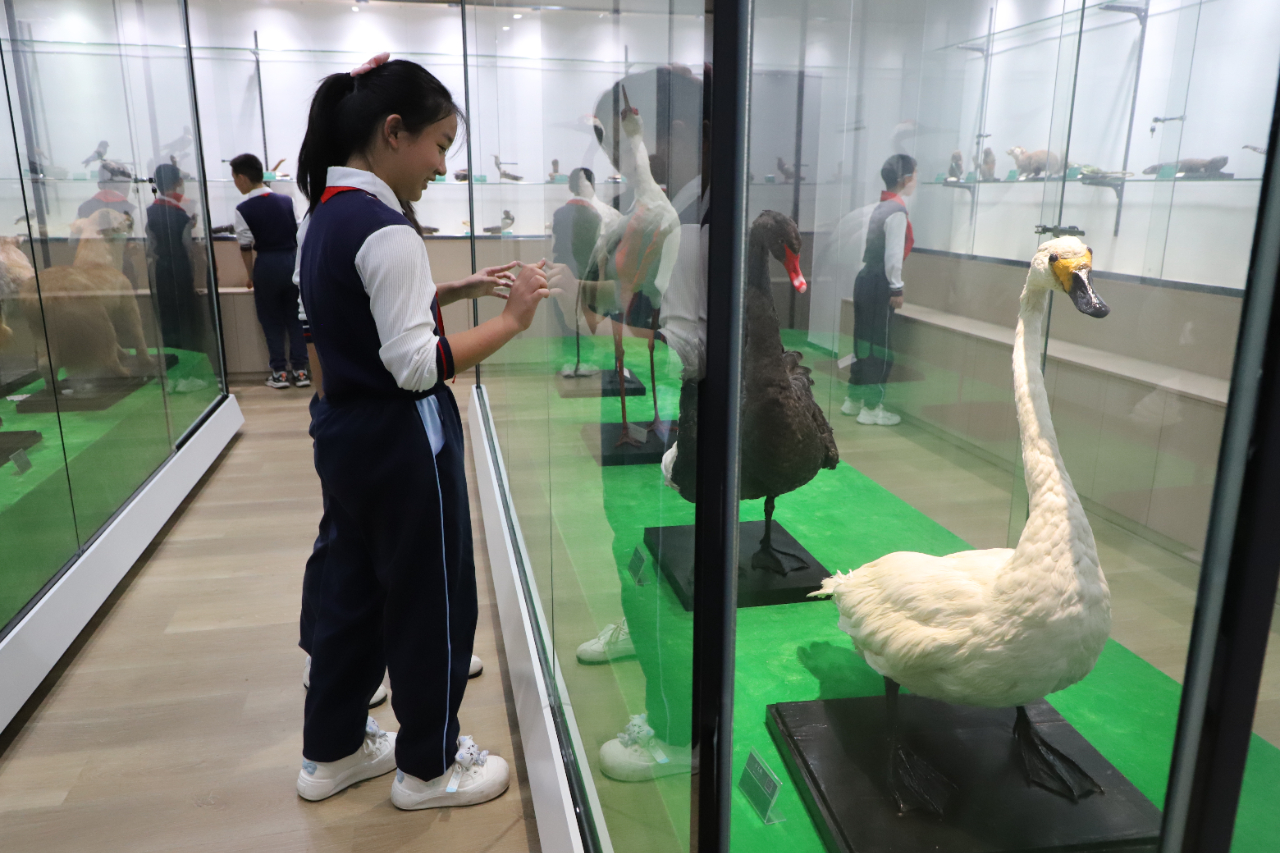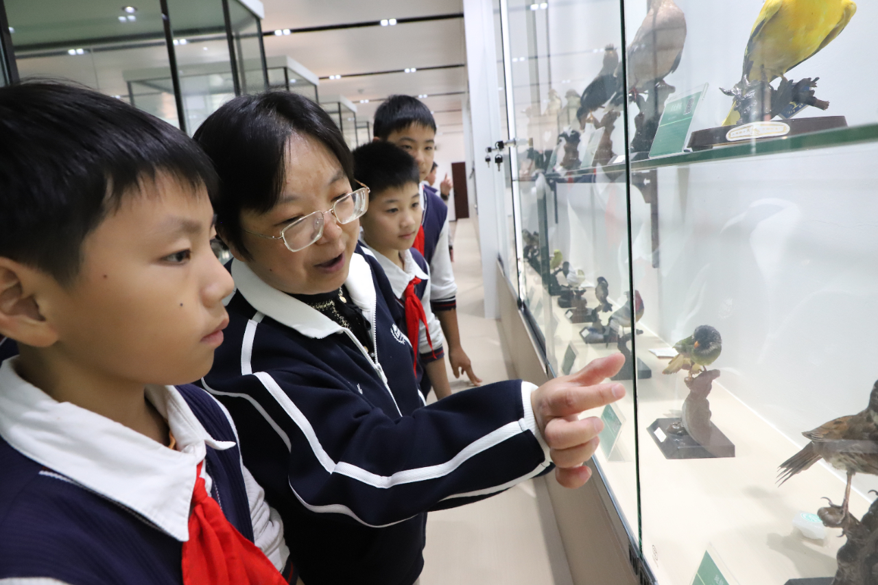 在生物标本展览室,同学们被种类繁多、制作精美的动物标本所深深吸引。他们认真聆听讲解,仔细观察各类标本的形态特征,不时发出阵阵惊叹,并就自己感兴趣的问题与指导老师进行交流,展现出强烈的求知欲和细致的观察力。
