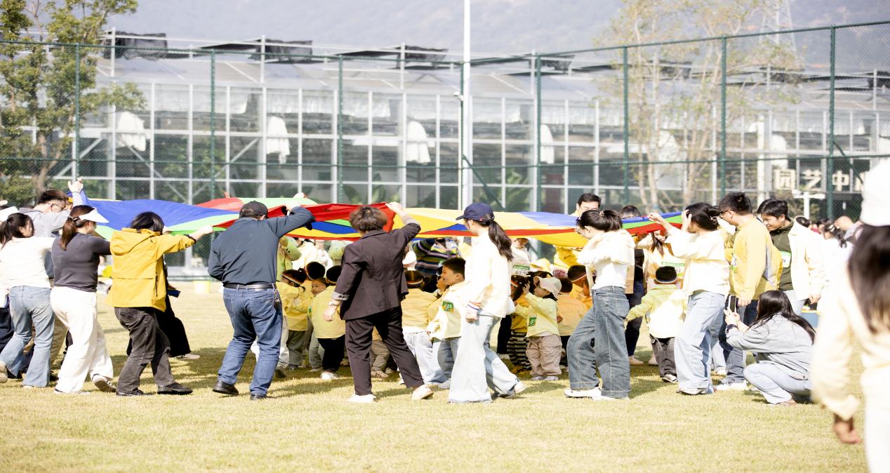 启动仪式上,亲子律动操让大家舒展身心,随后的彩虹伞游戏更是点燃全场氛围。“大风车”环节中,家长与孩子随着“一倍速散步、五倍速奔跑”的口令协作转动伞面,彩色伞面如流动的画卷;“狼来了”时,家长迅速压低伞面将孩子护在“安全罩”下,亲子间的信任在游戏中悄然升温。