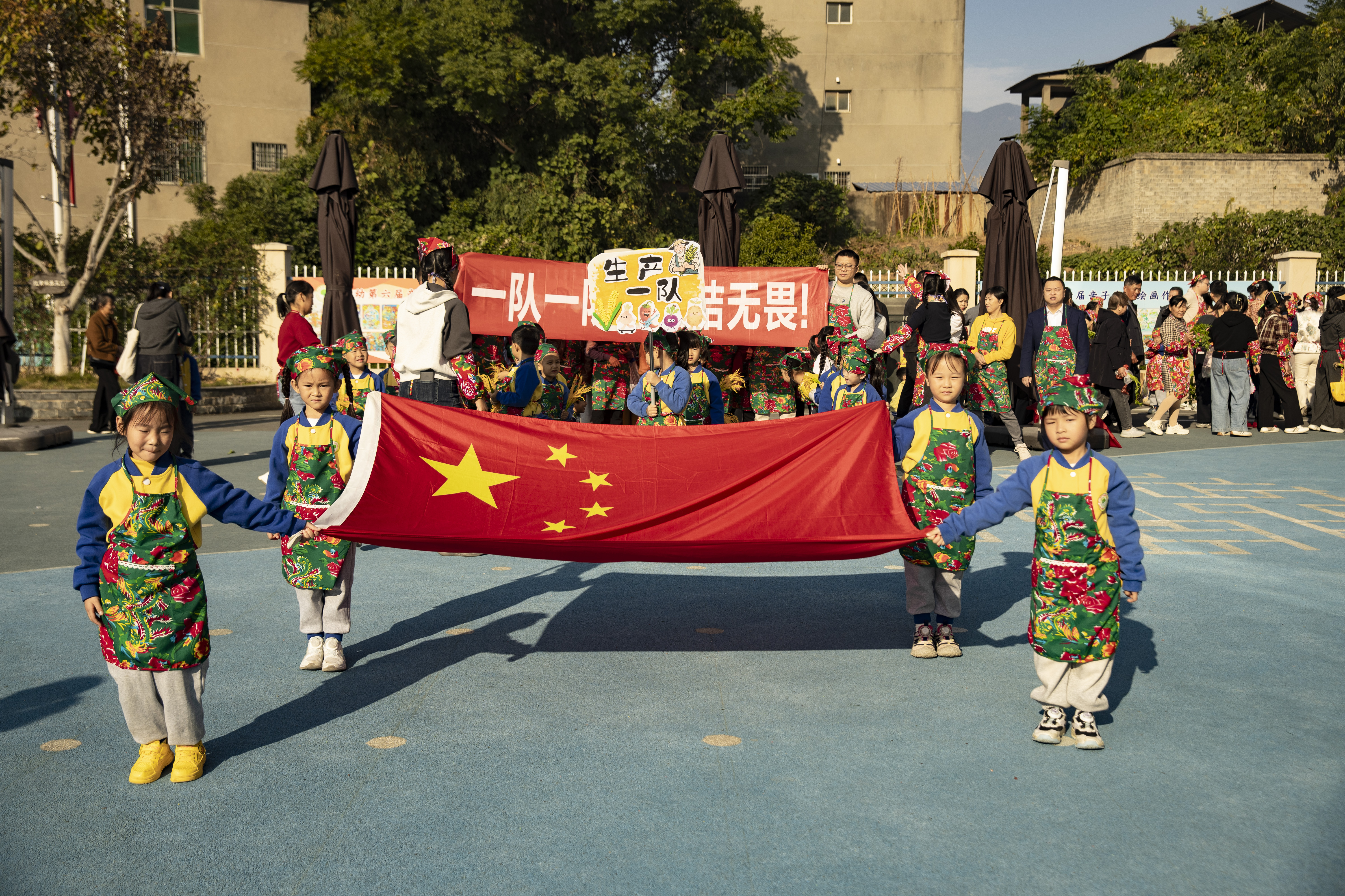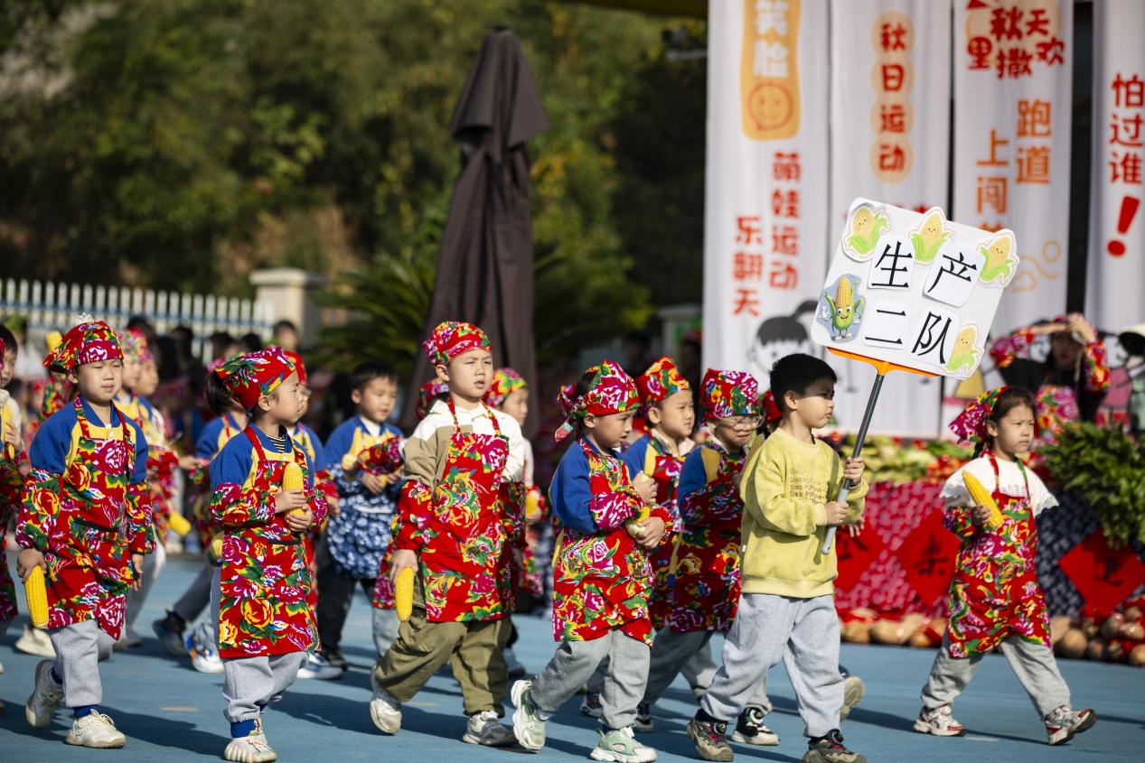 8点半,国旗队引领7个大班方阵精彩登场,创意农耕造型引得掌声不断。升旗仪式后,园领导致辞宣布运动节开幕,集体舞《丰收之歌》中亲子携手起舞,尽情挥洒丰收的喜悦。